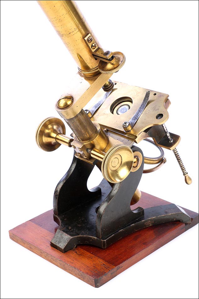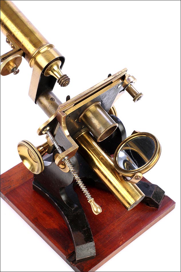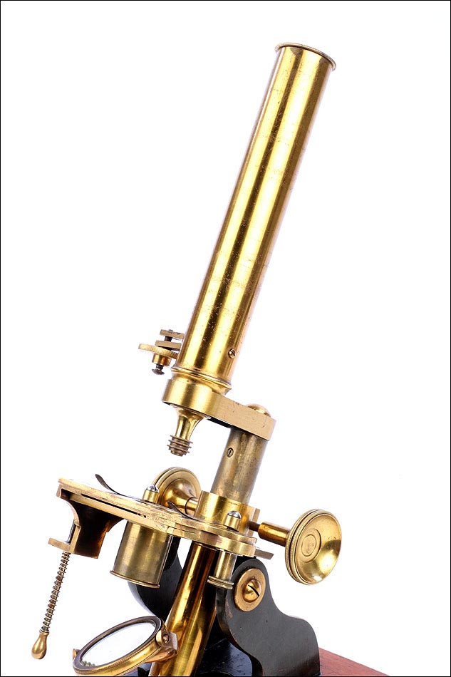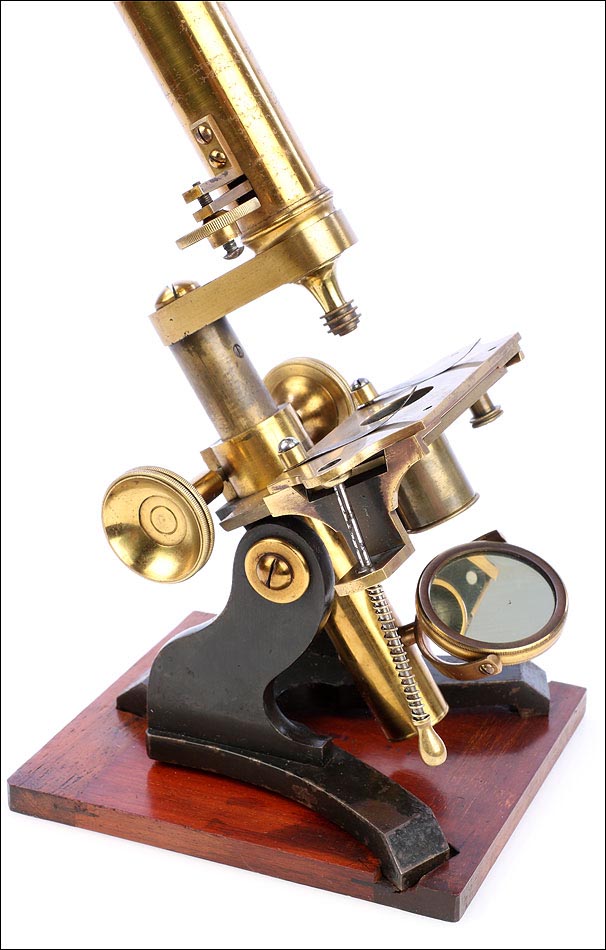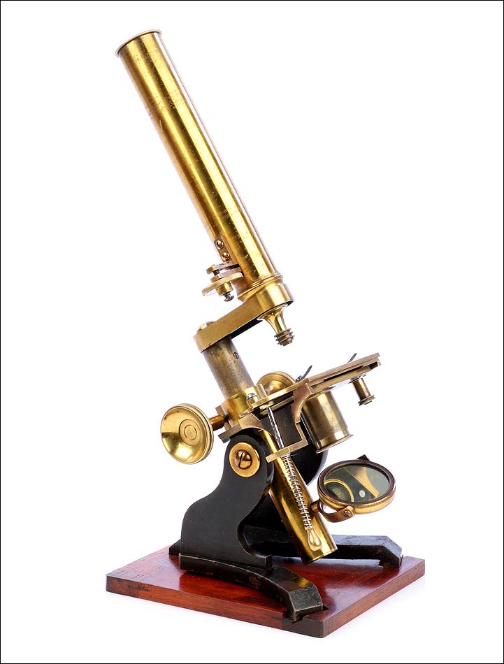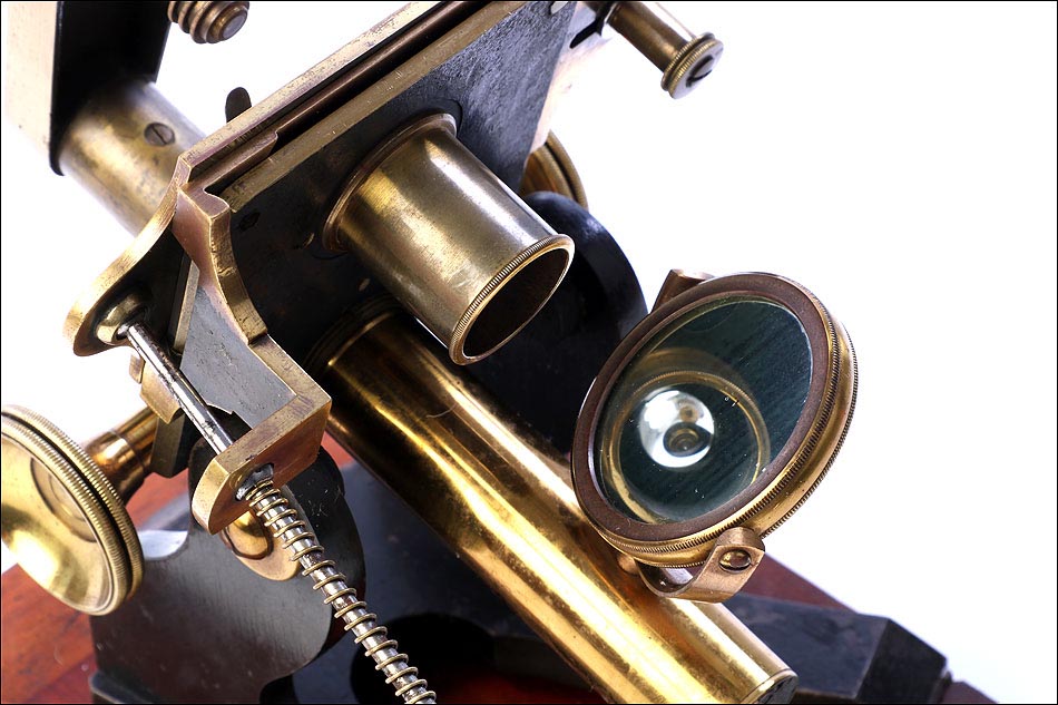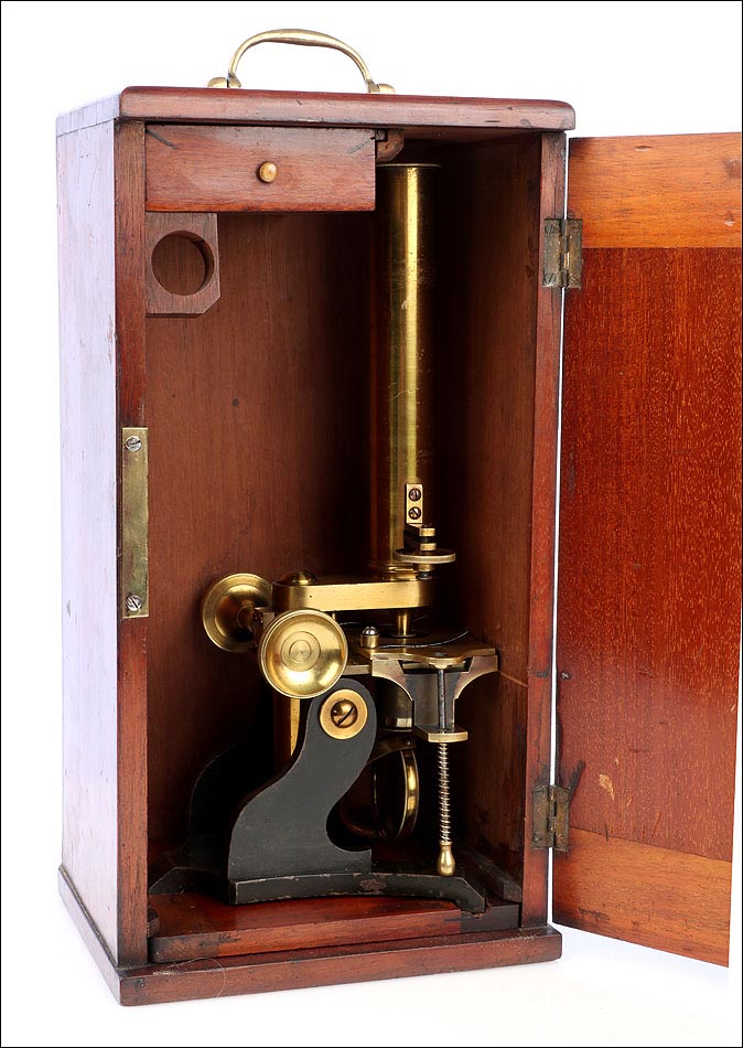Por su belleza y su buen estado, este antiguo microscopio compuesto inglés con estuche es una pieza de coleccionista digna de ocupar un lugar especial.