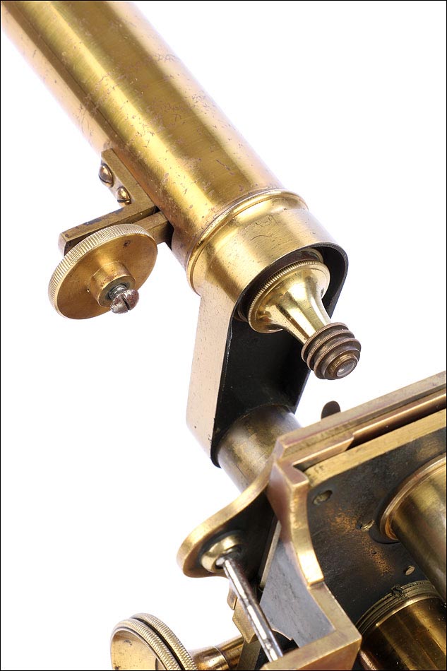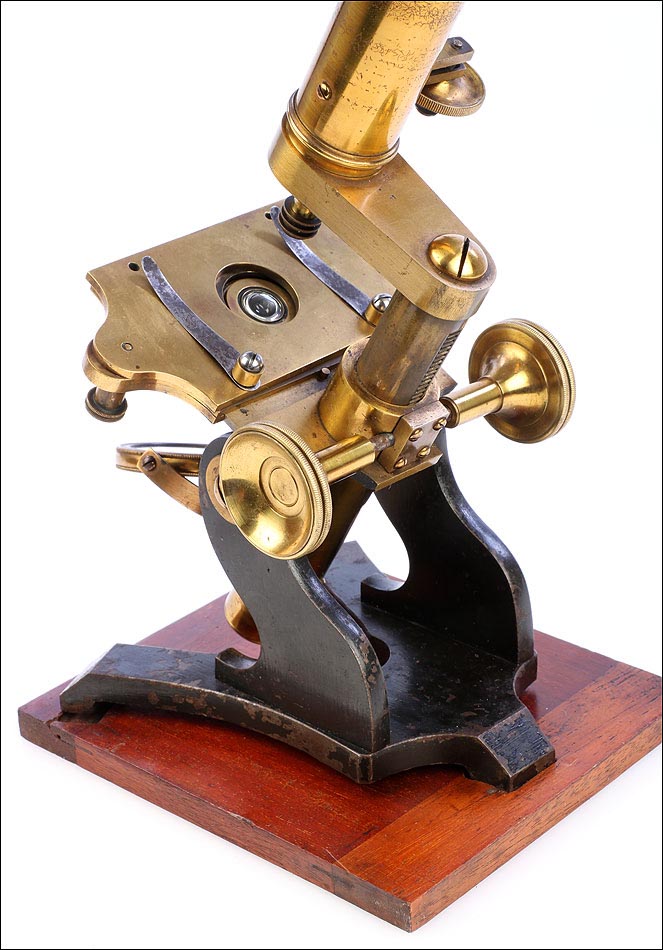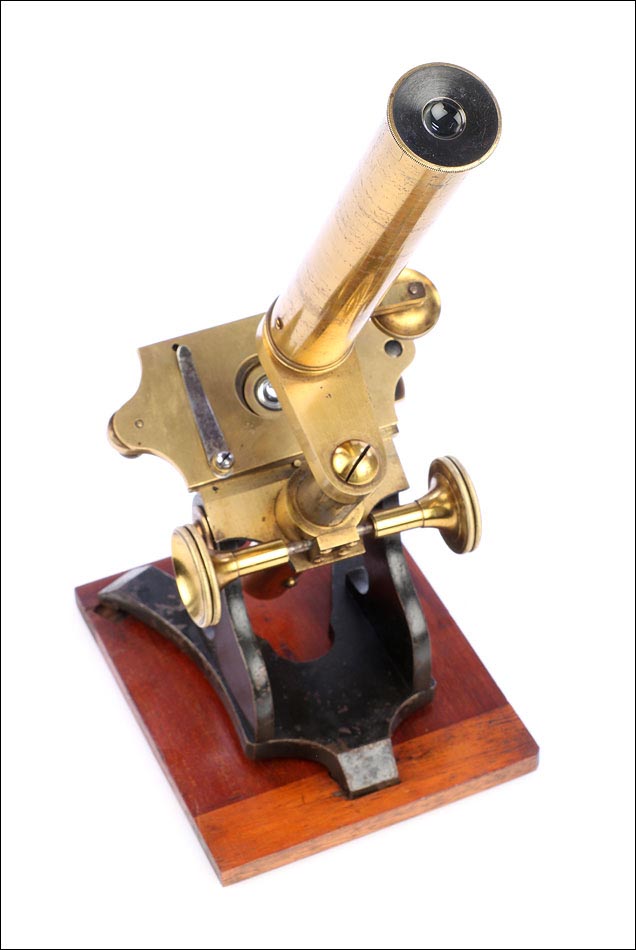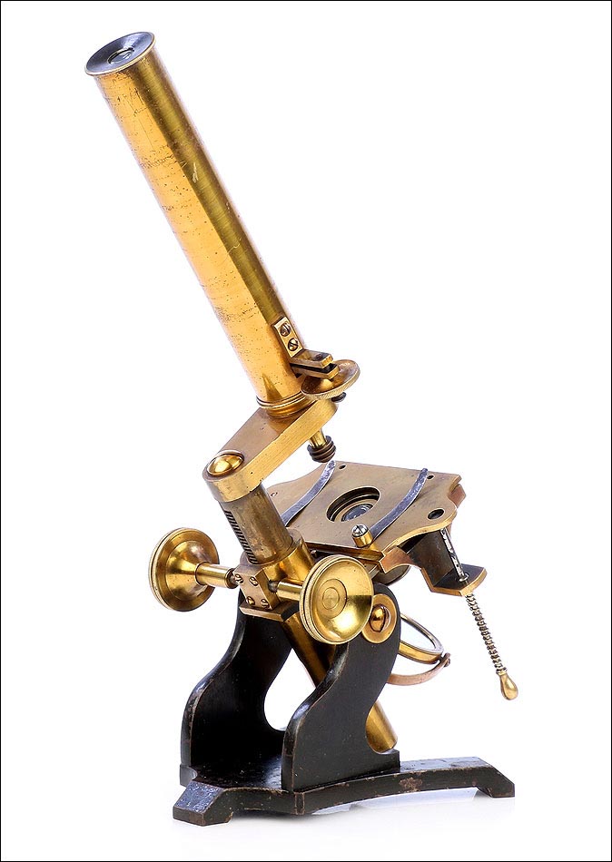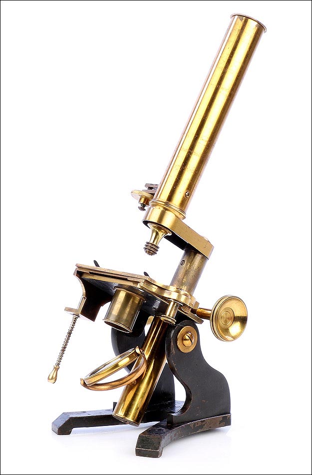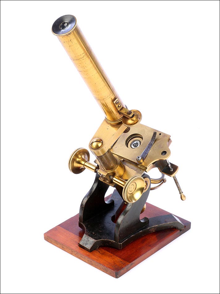 Por su belleza y su buen estado, este antiguo microscopio compuesto inglés con estuche es una pieza de coleccionista digna de ocupar un lugar especial.