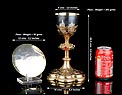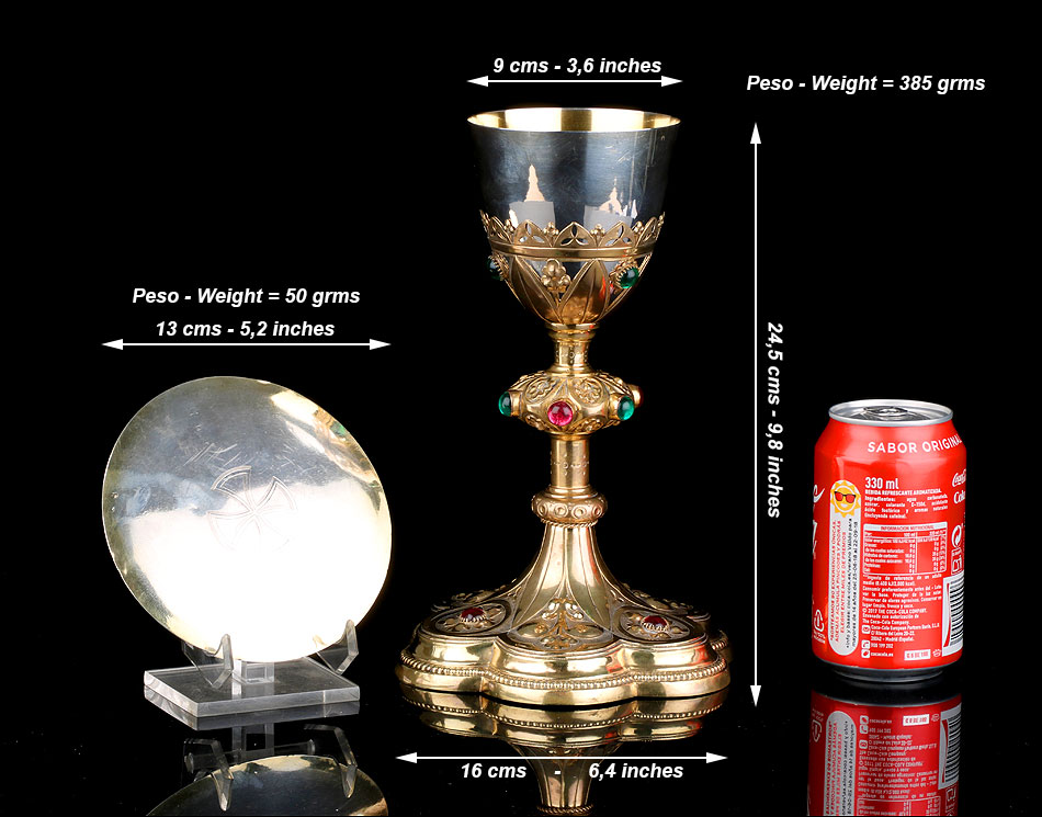 Medidas: Cáliz: Ancho de la Base: 16 cm. Altura: 24,5 cm. Ancho de la Copa: 9 cm. Peso: 385 g. Patena: Diámetro: 13 cm. Peso: 50 g.