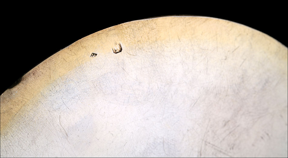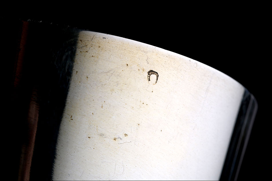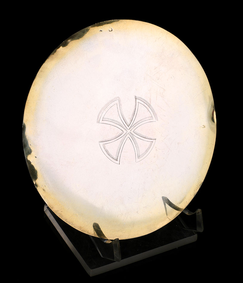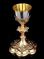 Antiguo cáliz y patena en plata y latón dorado, procedente de Francia y fechado circa 1900. El cáliz lleva pie y tallo en latón dorado y copa de plata maciza, mientras que la patena es de plata. Tanto la patena como el cáliz llevan contrates que identifican las piezas: podemos distinguir el sello de la plata francesa antigua con el perfil de la diosa Minerva, así como el contraste del platero (con forma de rombo). El cáliz solo lleva contraste en la copa de plata maciza. Es un artículo de estética potente y hermosa, con forma estilizada y una rica combinación de tonos y colores.