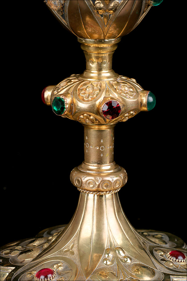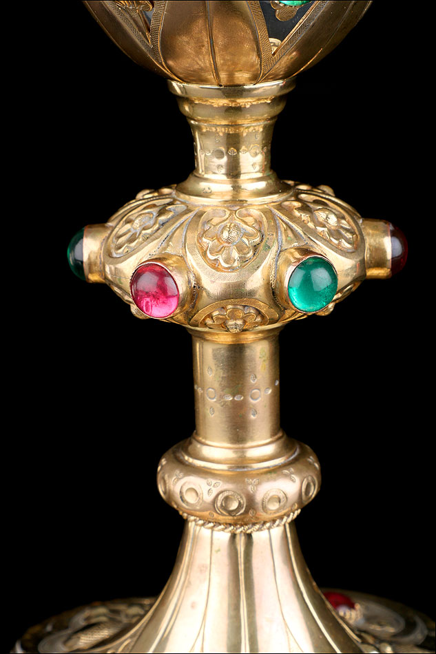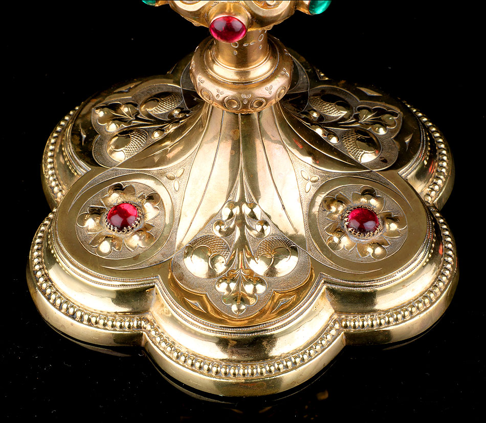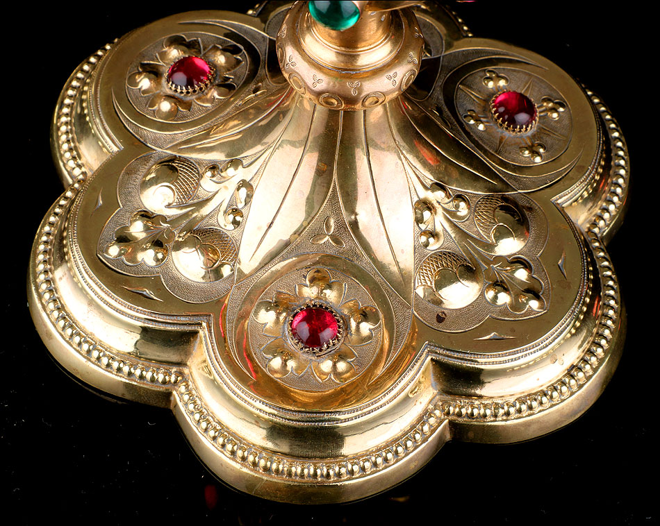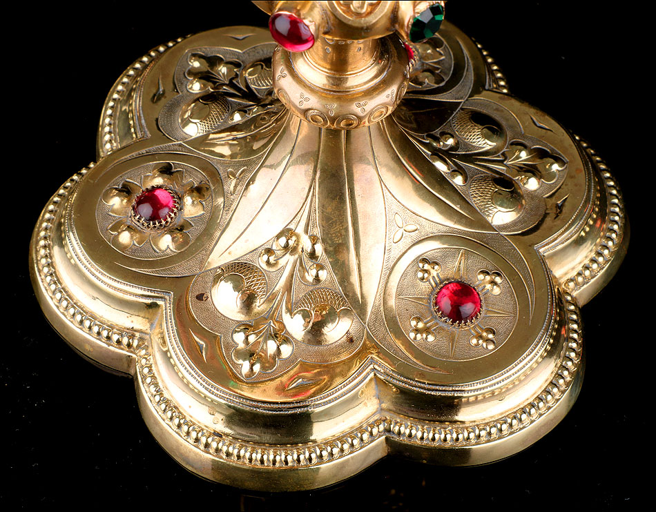 El pie del cáliz lleva una amplia base lobulada, decorada con finos grabados hechos a mano, apliques dorados y cristales de colores. En ella podemos ver tres cristales de color granate, originales de época. Sobre ella se alza el tallo, con un nudo principal decorado con cristales granates y verdes y otro secundario por debajo. Ambos llevan motivos ornamentales grabados, de inspiración floral. En el nudo principal, dos de los cristales están tallados; esto sugiere que podían haber sido reemplazados en algún momento.