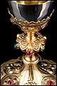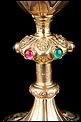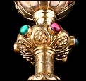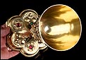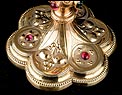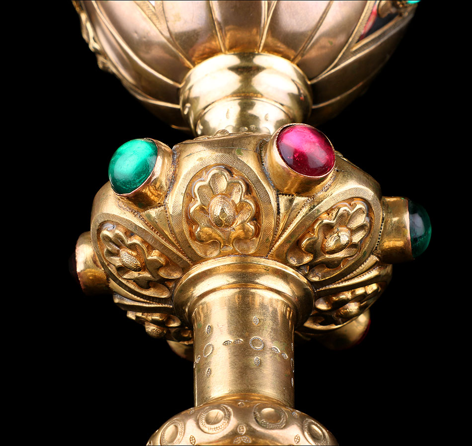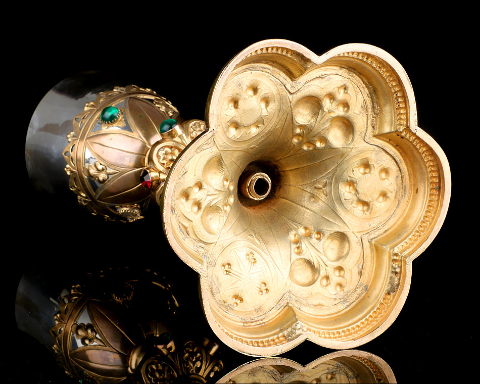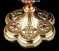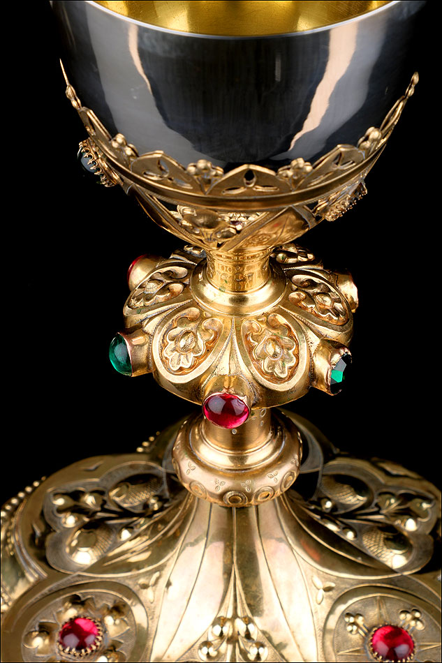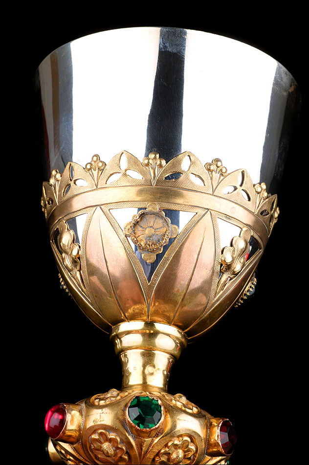 El pie del cáliz lleva una amplia base lobulada, decorada con finos grabados hechos a mano, apliques dorados y cristales de colores. En ella podemos ver tres cristales de color granate, originales de época. Sobre ella se alza el tallo, con un nudo principal decorado con cristales granates y verdes y otro secundario por debajo. Ambos llevan motivos ornamentales grabados, de inspiración floral. En el nudo principal, dos de los cristales están tallados; esto sugiere que podían haber sido reemplazados en algún momento.