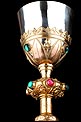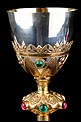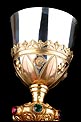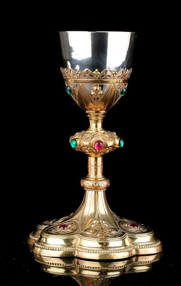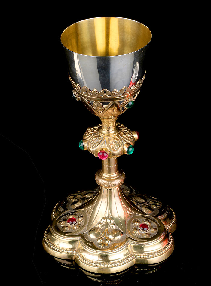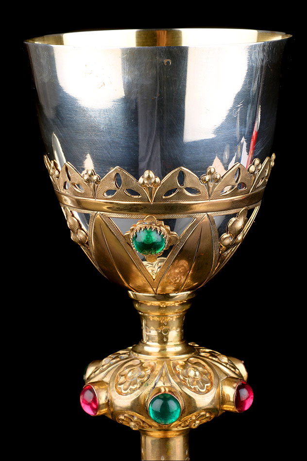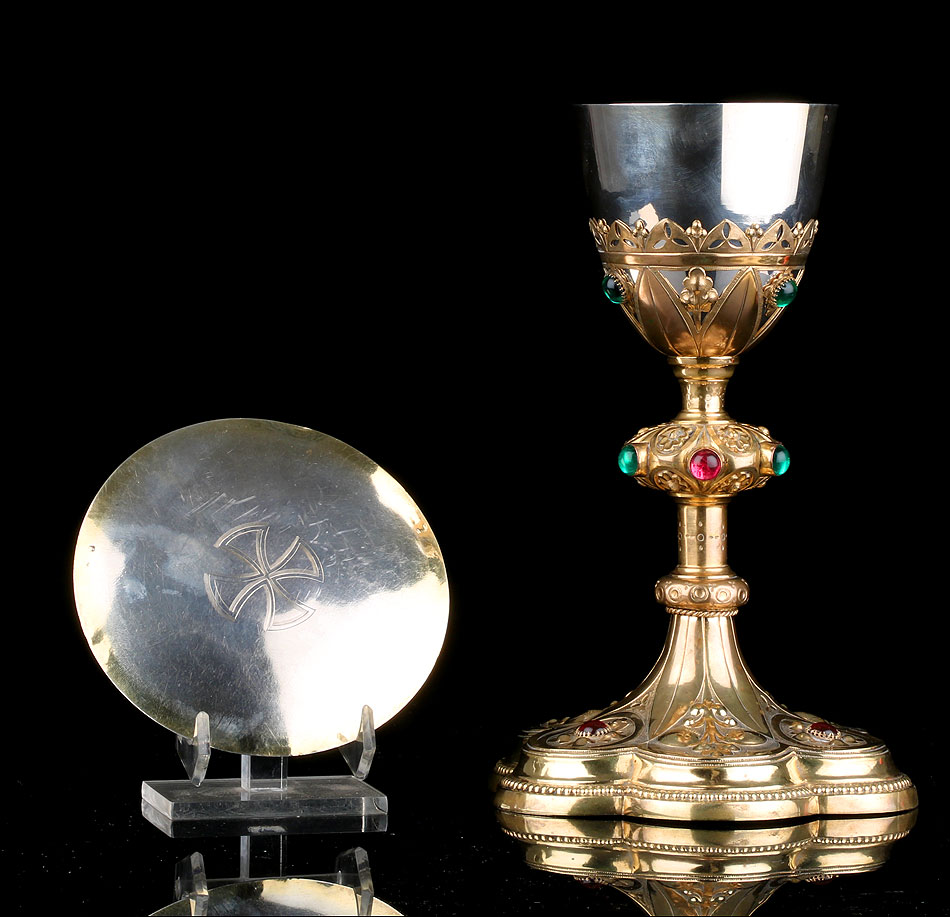 La copa de plata está soportada por una base de latón tallada en celosía, con diseño de inspiración neogótica. Está formada por hojas alargadas simétricas, intercaladas con flores adornadas con cristales. Uno de los cristales verdes que decoran esta parte ha desaparecido. La base contiene una elegante copa de plata, estilizada y en magnífico estado. Por su parte, la patena de plata muestra un diseño muy sobrio, con una cruz latina grabada a mano en el centro como única decoración.
