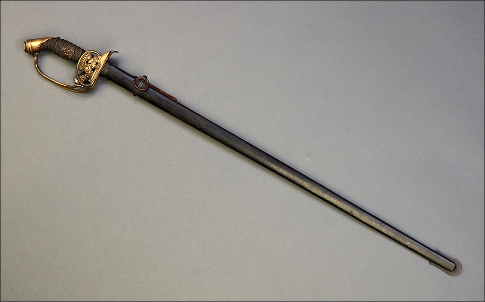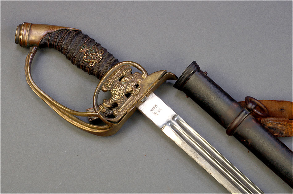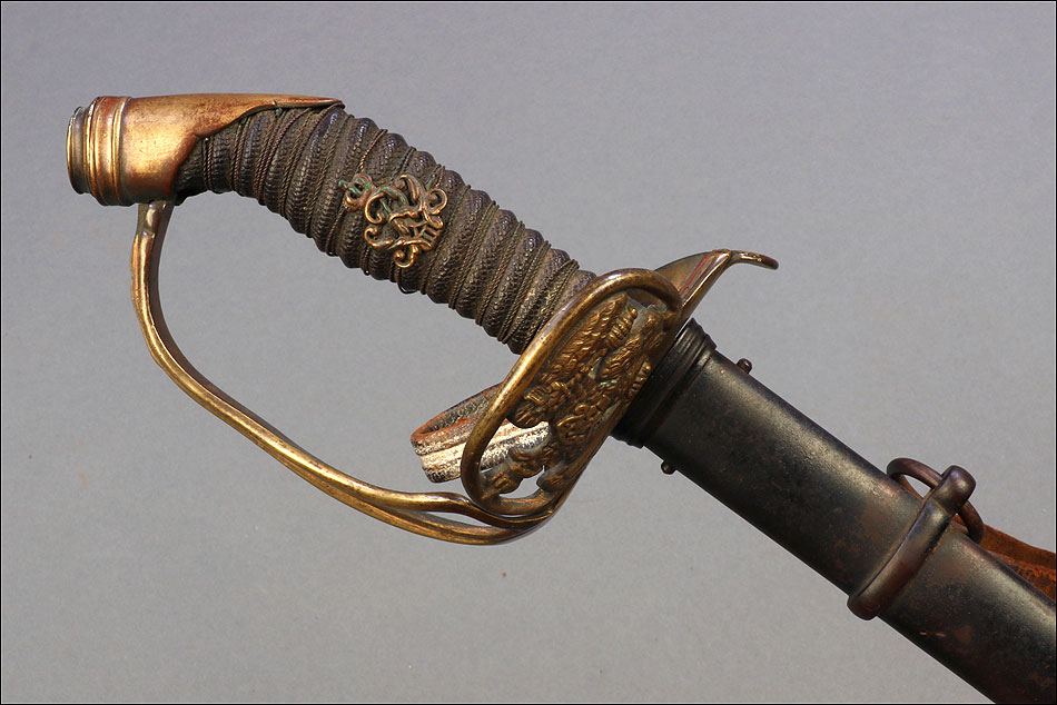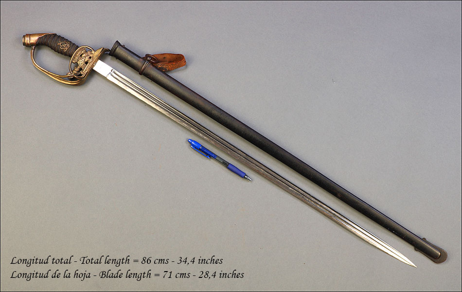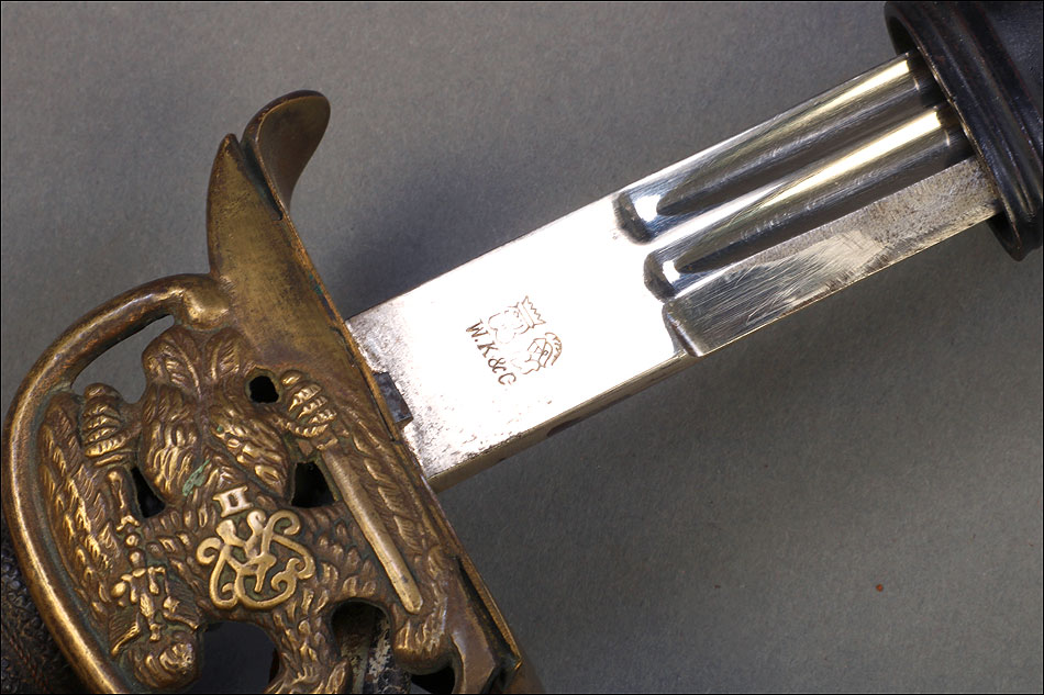 La empuñadura de la espada está fabricada en latón y se encuentra en buen estado. Es de tipo plegable: tanto la cruz como el guardamano se pueden recoger. En la cruz podemos ver la imagen de un águila coronada que sostiene un cetro y una espada. En el pecho, el ave lleva un monograma que se repite en el puño. El puño conserva la lija y el torzal originales en buenas condiciones, así como el pomo de latón al que se une el guardamano. El metal presenta una bella pátina rojiza que aumenta la belleza de la espada. En la parte superior de la hoja podemos ver grabada la inscripción W. K. & C., correspondiente al fabricante. Por su parte, la vaina de metal negro aún conserva la tira de cuero original destinada a colgar la espada del uniforme.
