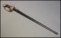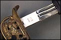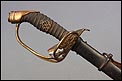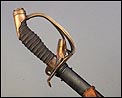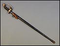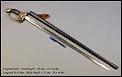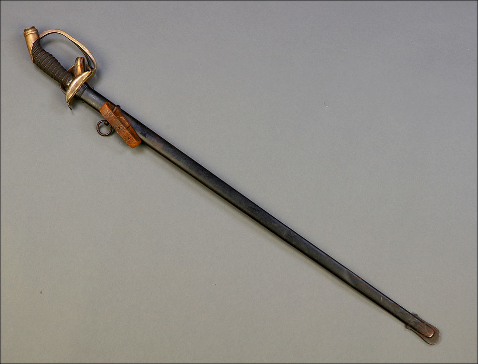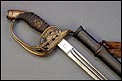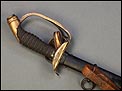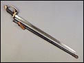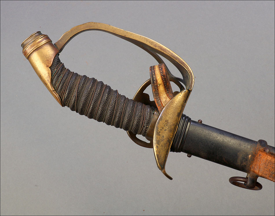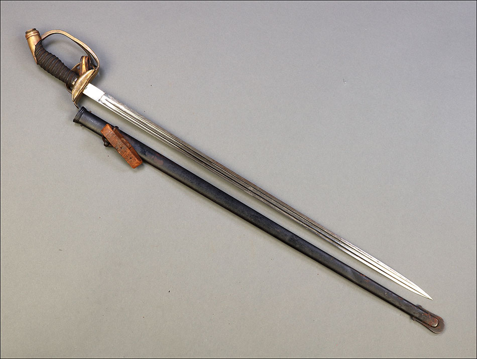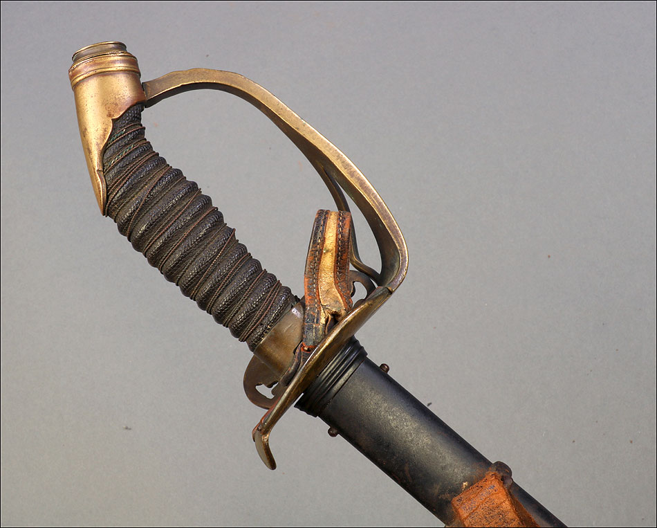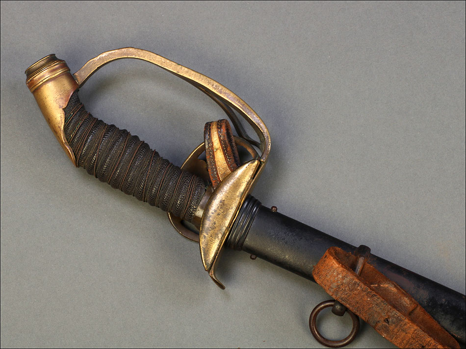 La empuñadura de la espada está fabricada en latón y se encuentra en buen estado. Es de tipo plegable: tanto la cruz como el guardamano se pueden recoger. En la cruz podemos ver la imagen de un águila coronada que sostiene un cetro y una espada. En el pecho, el ave lleva un monograma que se repite en el puño. El puño conserva la lija y el torzal originales en buenas condiciones, así como el pomo de latón al que se une el guardamano. El metal presenta una bella pátina rojiza que aumenta la belleza de la espada. En la parte superior de la hoja podemos ver grabada la inscripción W. K. & C., correspondiente al fabricante. Por su parte, la vaina de metal negro aún conserva la tira de cuero original destinada a colgar la espada del uniforme.