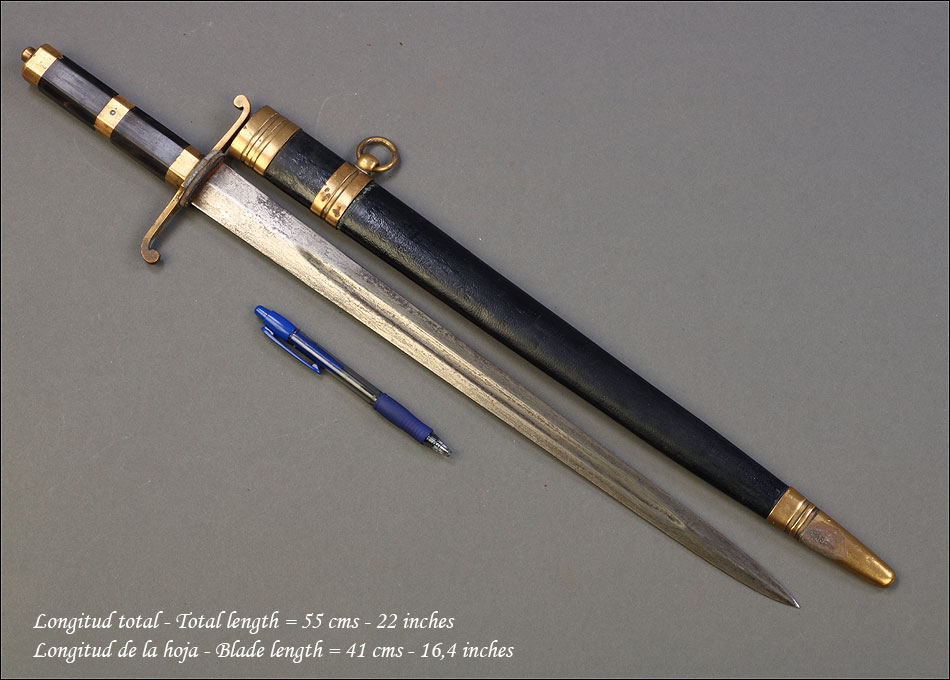 Fantástica y antigua daga naval británica fabricada en Inglaterra a finales del siglo XIX, cien por cien auténtica y en muy buenas condiciones. La daga se presenta con su vaina original de época y muestra un estado óptimo, tal y como podemos ver en las fotografías. La hoja de acero tiene algunas zonas ligeramente oscurecidas por el paso del tiempo, un detalle lógico si tenemos en cuenta que la daga tiene más de cien años de antigüedad. Esta pátina, por otra parte, le aporta a la pieza un encanto muy singular. La empuñadura lleva cruz recta con extremos curvados en forma de S. El puño combina madera de color negro con piezas de latón, una mezcla de tonos y acabados que estéticamente funciona muy bien. La vaina muestra la misma combinación, con cuerpo de cuero de color negro y boquilla, batiente y anilla de latón. Al igual que la propia daga, se conserva en excelentes condiciones.