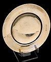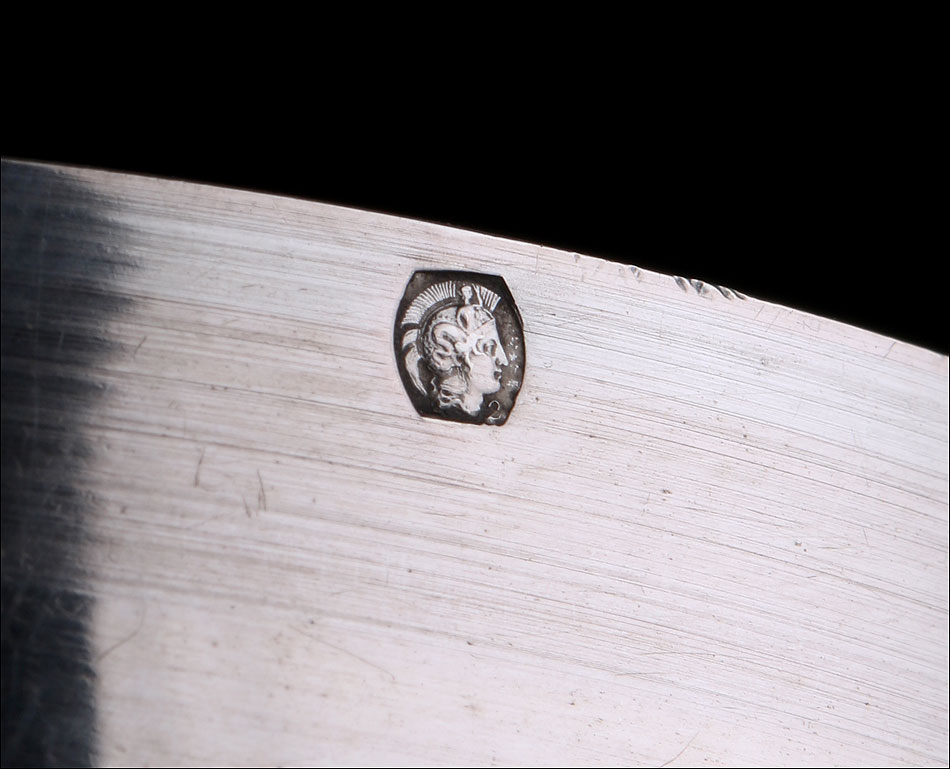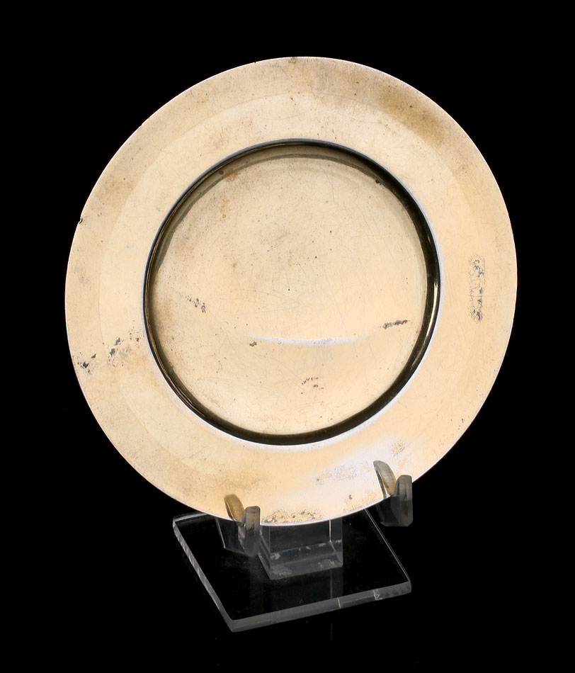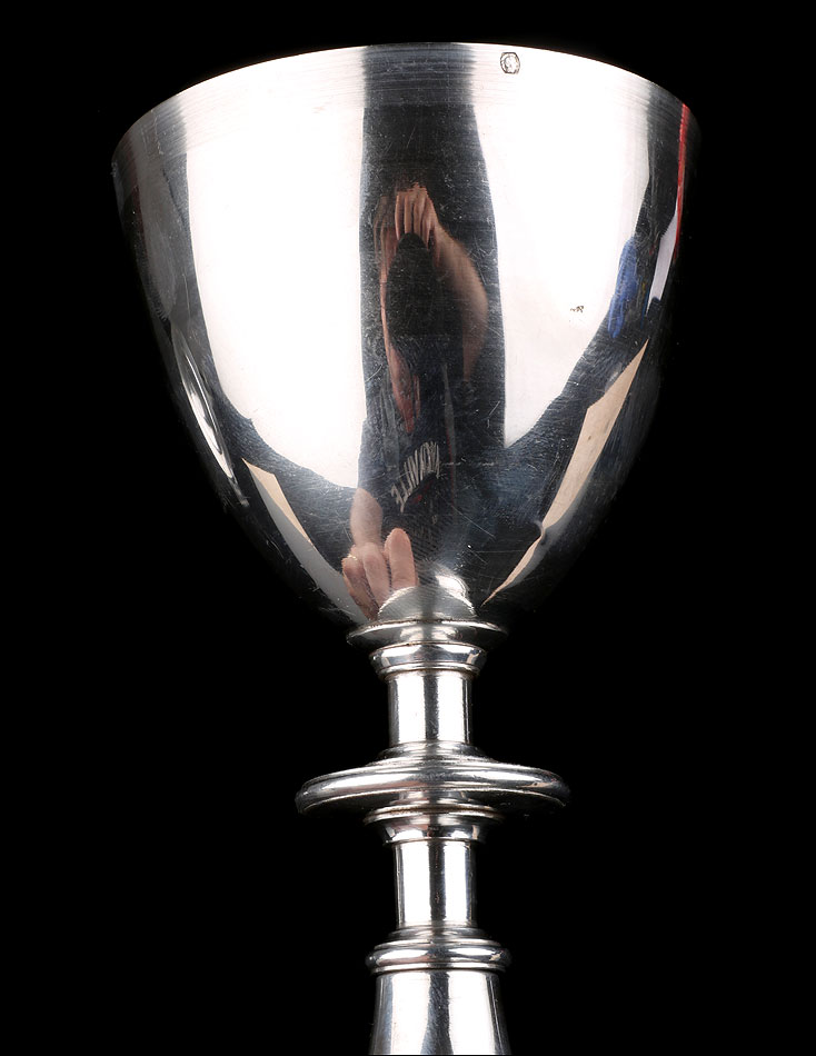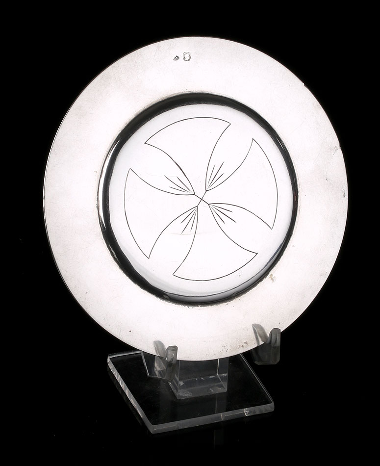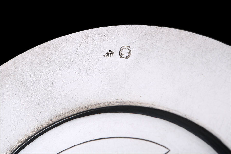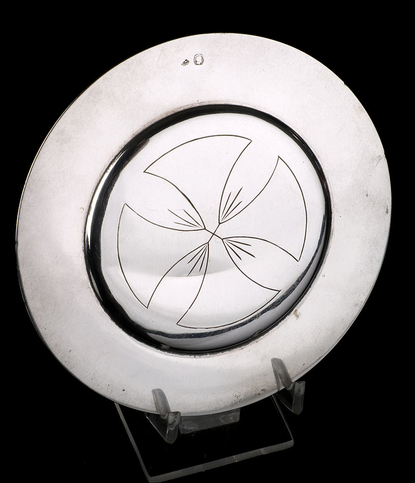 La patena que se presenta con el cáliz es está decorada con una gran cruz griega grabada a mano. En el borde descubrimos los contrastes que dan fe de su época y su calidad: el perfil de la diosa Minerva y un rombo con las iniciales NH. Como comentábamos, en el centro de la pieza podemos ver una ligera deformación, producida probablemente por un golpe. Por lo demás, este conjunto de cáliz y patena de plata ha sobrevivido con dignidad hasta nuestros días.