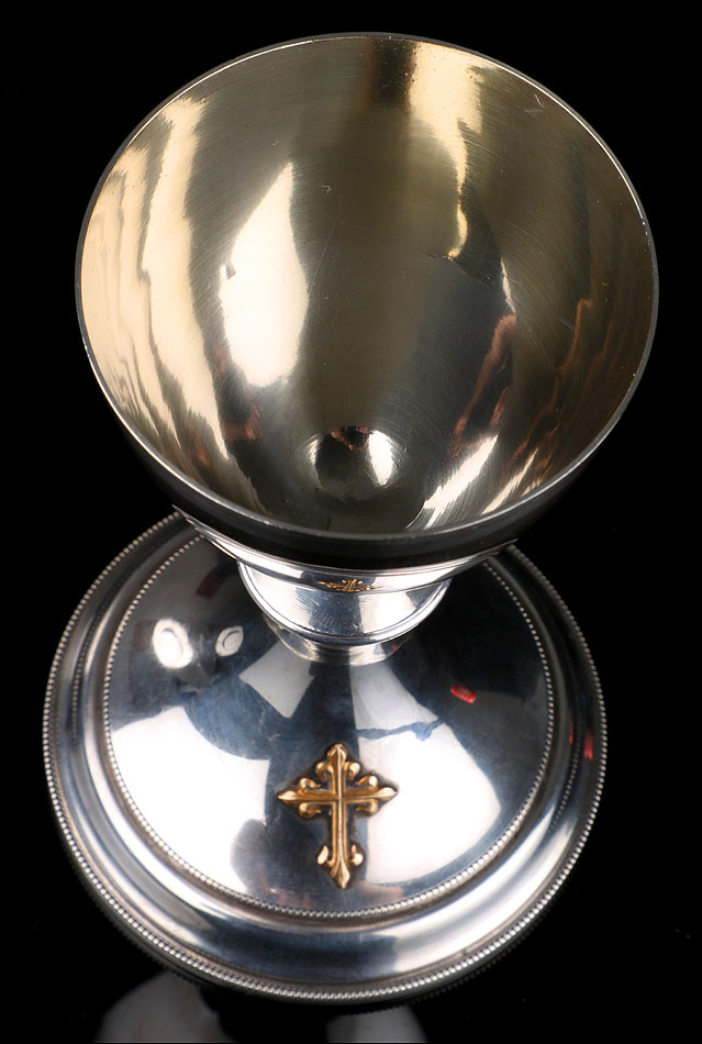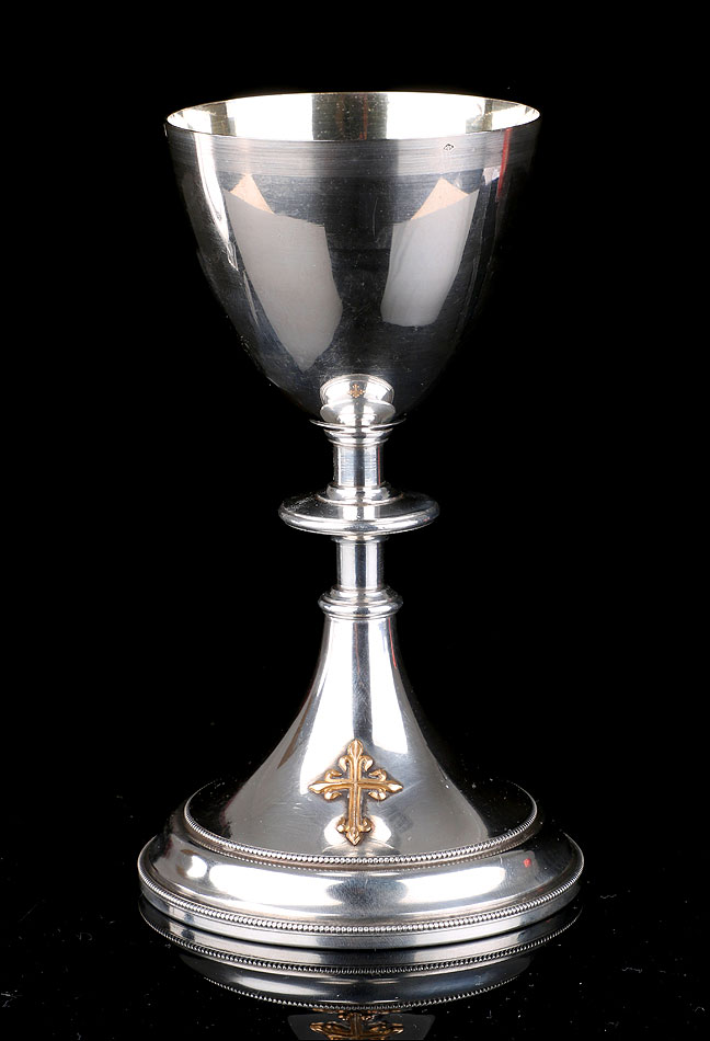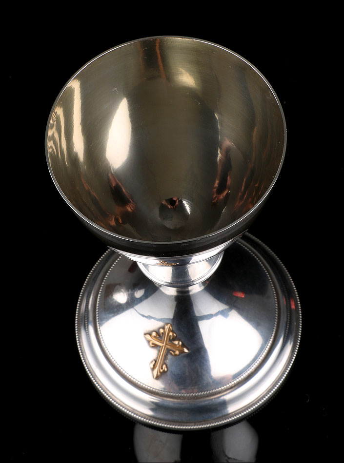 Antiguo cáliz y patena de viaje en plata maciza fabricado en Francia a principios del siglo XX o finales del XIX (circa 1900). Esta delicada pieza, sobria y de pequeño tamaño, se encuentra bien conservada y está fabricada íntegramente en plata. Aunque solo lleva un contraste (situado en la copa), tras efectuar la prueba del ácido se ha comprobado que toda la pieza está realizada en este metal. El cáliz va acompañado de una patena original de época, también de plata contrastada. La patena tiene un desperfecto en el centro, mientras que el cáliz se encuentra en muy buenas condiciones. Ambas piezas conforman un conjunto hermoso y sencillo, con todo el encanto de la platería religiosa antigua.