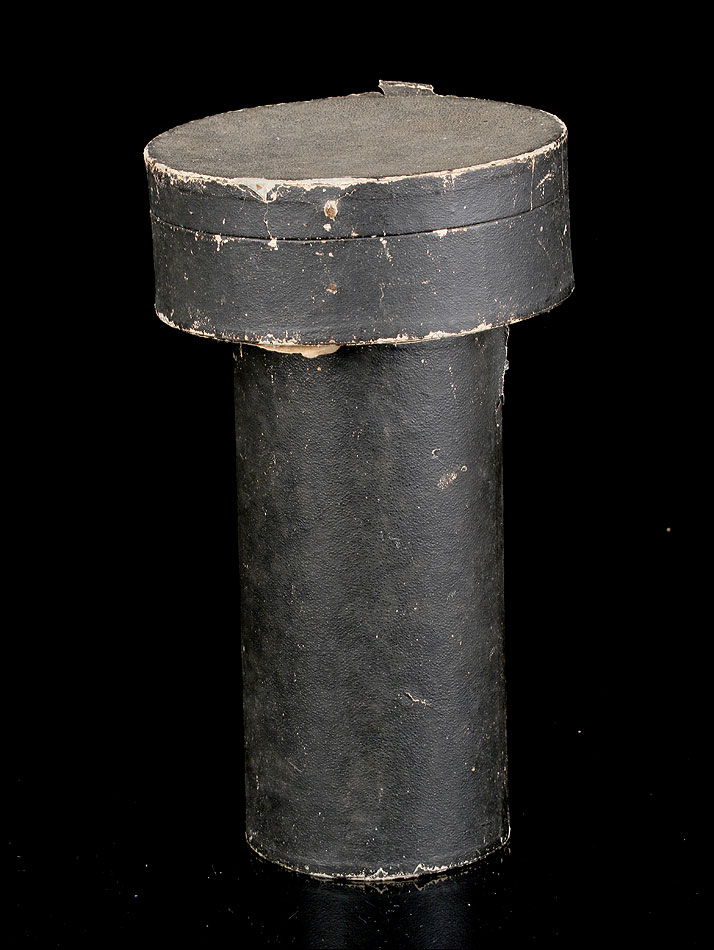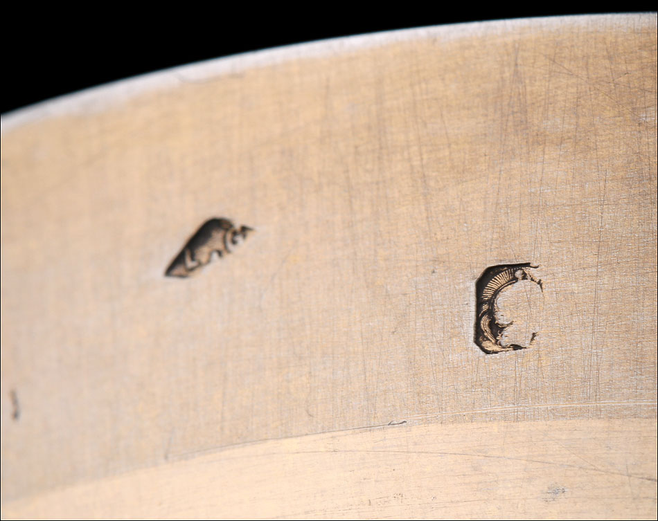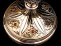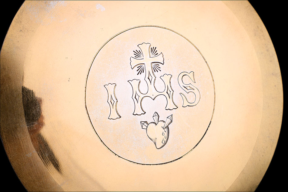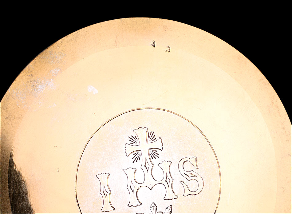 La patena de plata dorada está también en muy buen estado. El centro está decorado con una elegante inscripción grabada a mano, que muestra el Sagrado Corazón con las lanzas y el acrónimo de cristo, IHS. Junto al borde distinguimos los dos contrastes que marcan la pieza. El conjunto de cáliz y patena se guarda en el estuche original de época, fabricado en cartón forrado en símil piel negra. El estuche está desgastado por el paso del tiempo y el uso, pero sigue cumpliendo perfectamente su función.
