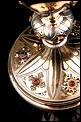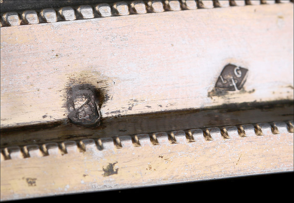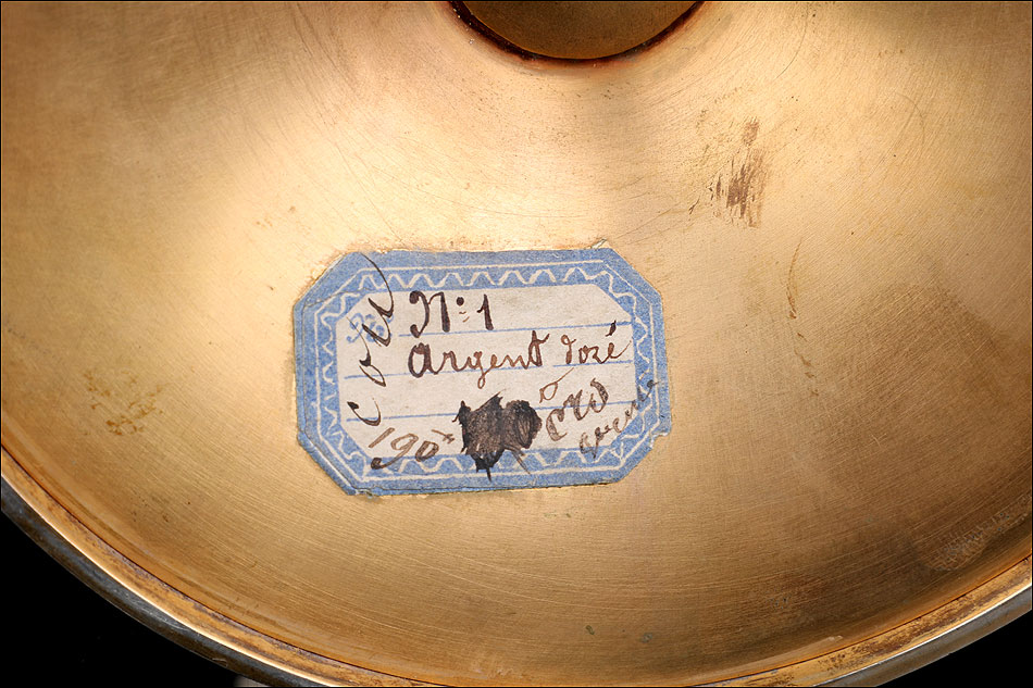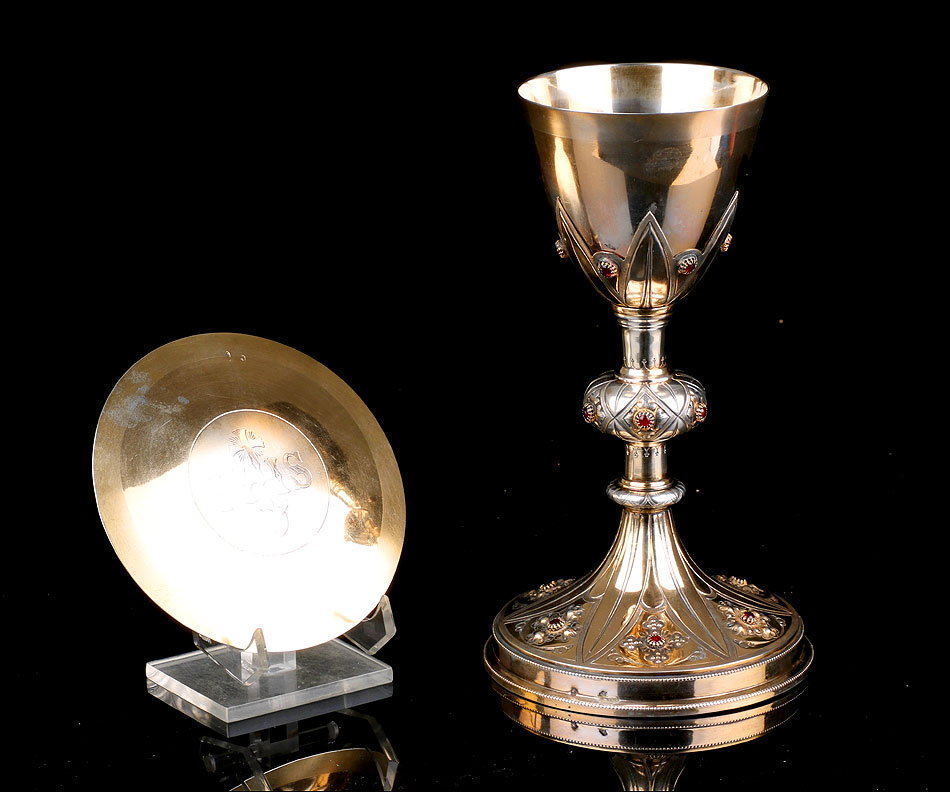 Antiguo cáliz en plata maciza dorada adornado con granates, con su estuche original y en muy buen estado de conservación. El cáliz está fechado circa 1880 y se presenta con una patena de plata. Las dos piezas llevan contrastes que garantizan la antigüedad y la calidad de la plata. En ambas podemos ver un contraste de orfebre con las iniciales LG, lo que indica que fueron realizadas por el orfebre Louis Guillat, que trabajó en Lyon desde 1861 a 1898. Tanto el cáliz como la patena están bien conservados y no muestran golpes, reparaciones o desperfectos. El acabado dorado está ligeramente desvaído por el paso del tiempo, pero el conjunto conserva su esencia y su belleza intactas.