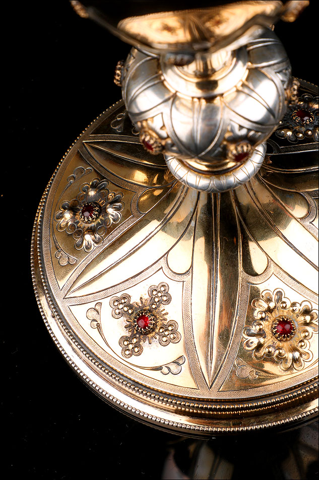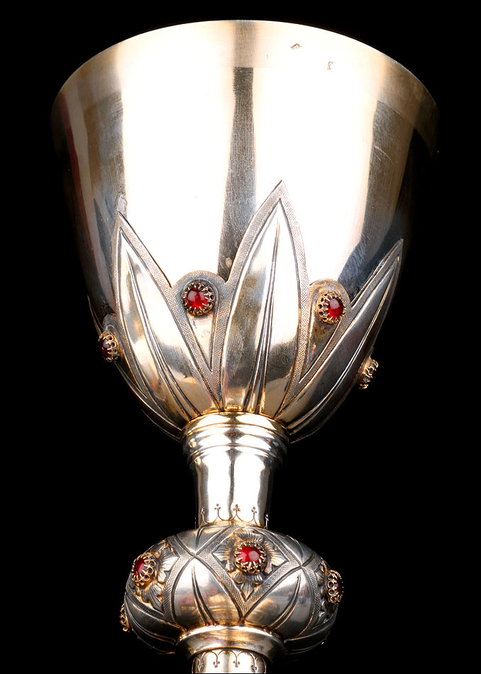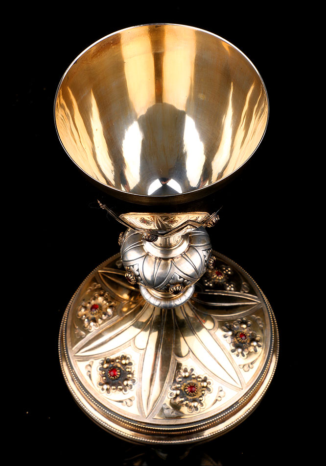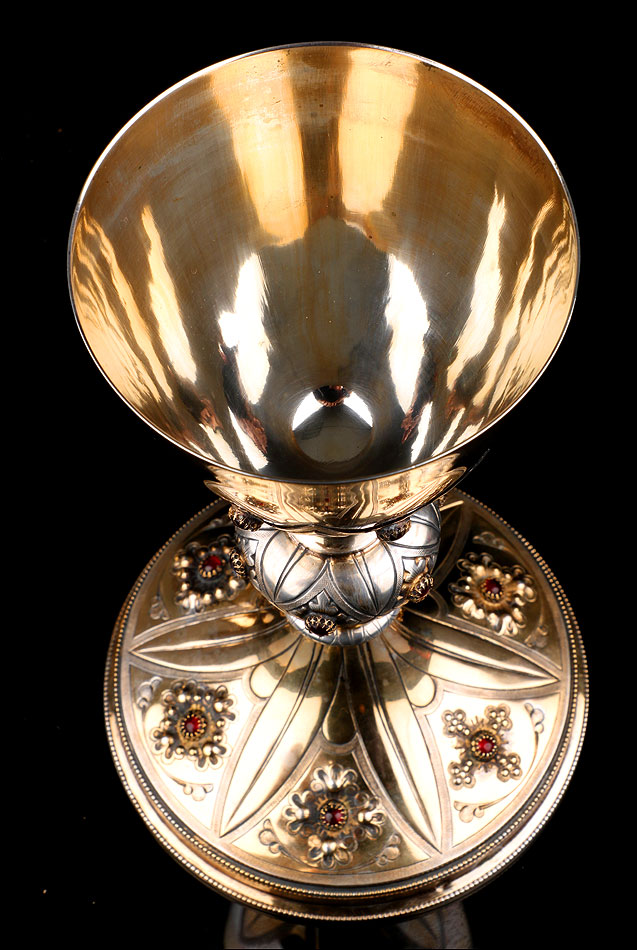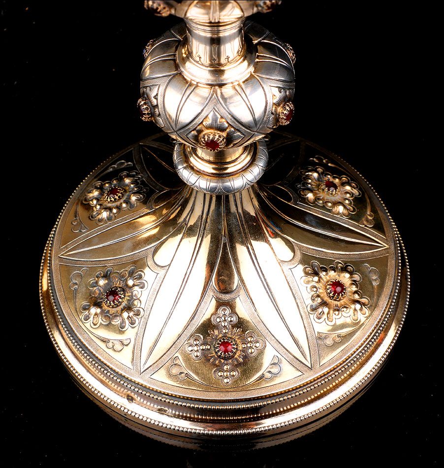 El cáliz es una pieza realmente hermosa. Muestra un delicado diseño de inspiración neogótica, decorado con granates en todas sus partes: base, nudo y copa. La base es circular y lleva una decoración de inspiración floral con seis granates. Los granates están colocados en el centro de las flores en relieve que decoran la pieza. Entre cada flor hay una hoja grabada que parte del tallo. Este consta de un pequeño nudo secundario y un nudo principal, más grande y también con piedras. La copa que se alza en la parte superior lleva grabadas unas hojas y flores similares a las de la base y luce la misma ornamentación. Las dos partes, base y copa, llevan sus correspondientes contrastes.