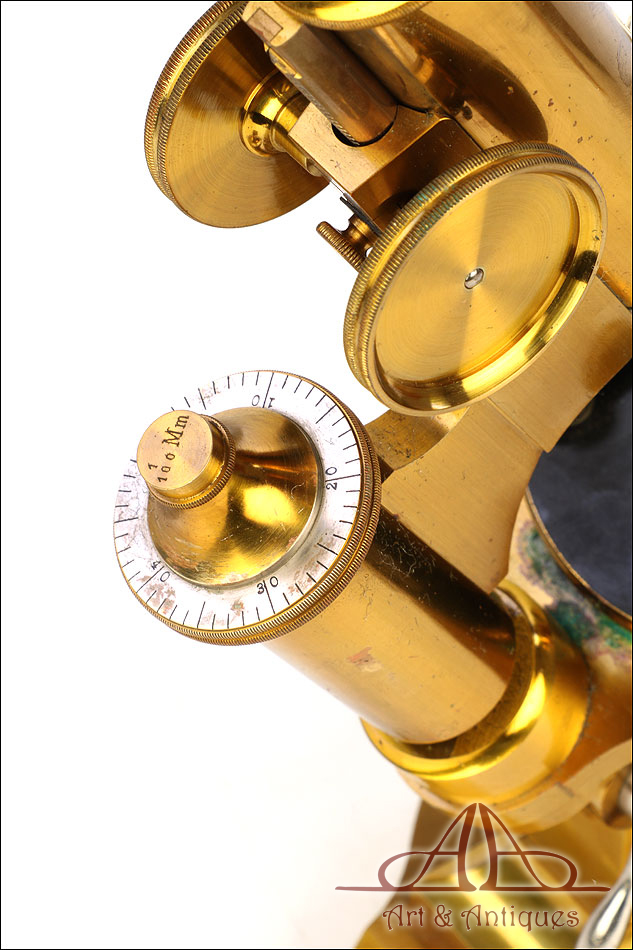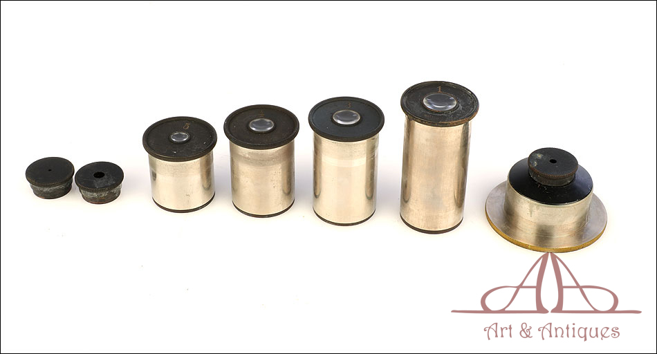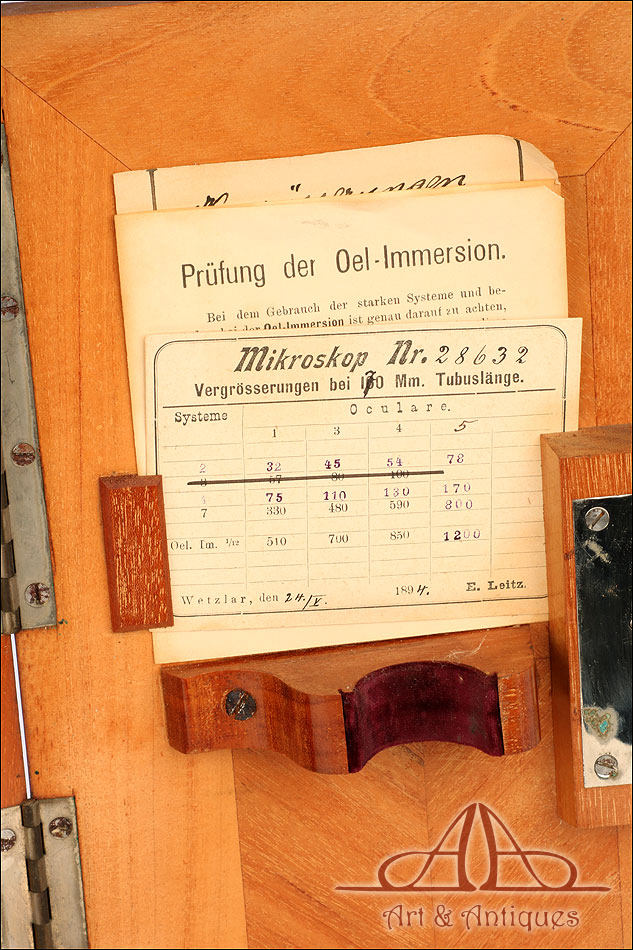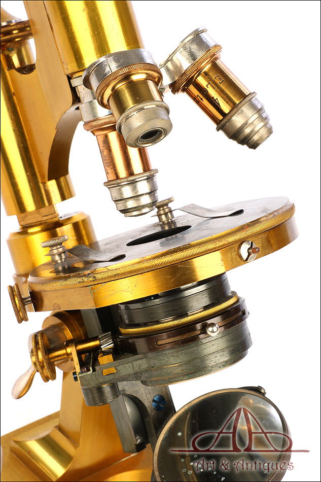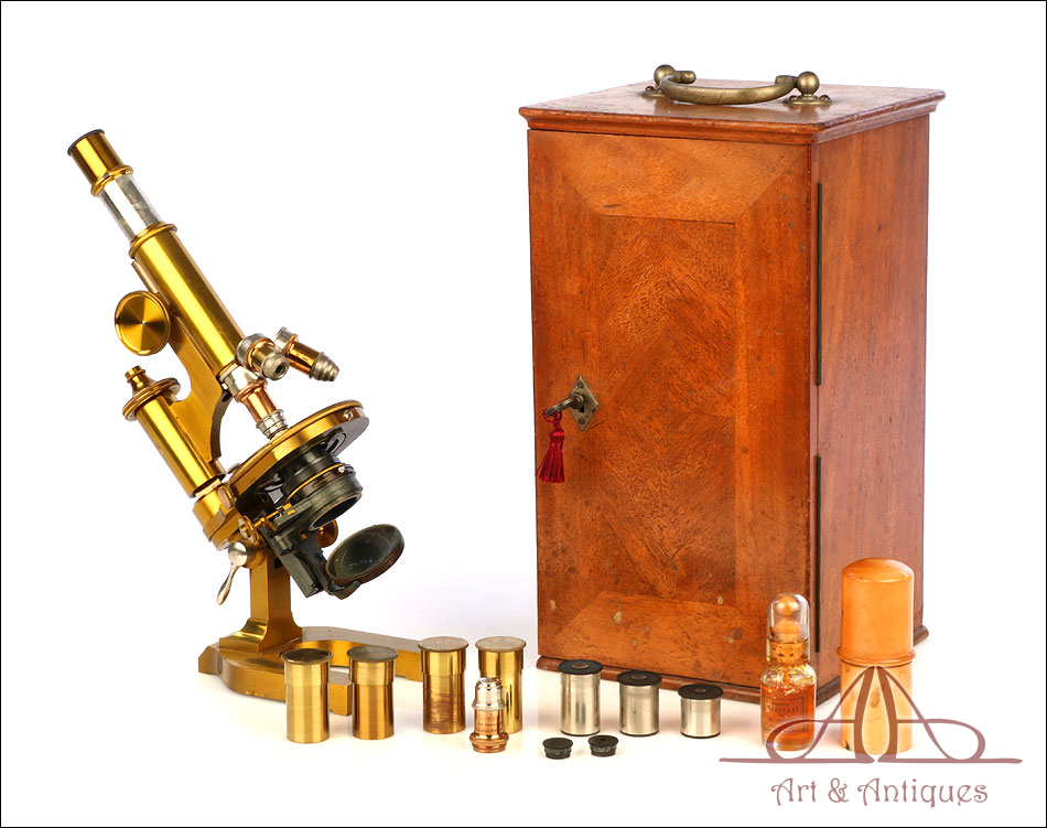 El microscopio se presenta en su estuche de madera de caoba original de época y va acompañado de un completo juego de accesorios, formado por cuatro oculares y cuatro objetivos. En el interior del estuche encontramos las especificaciones de fábrica, según las cuales el microscopio está completo. Lleva revólver de tres lentes, cremallera en perfecto estado de funcionamiento y sistema de ajuste fino muy bien conservado. Todas las piezas y componentes del microscopio funcionan muy bien y se mueven de manera fluida y suave. El juego de accesorios se acompaña de un frasco de aceite para los objetivos de inmersión en aceite.