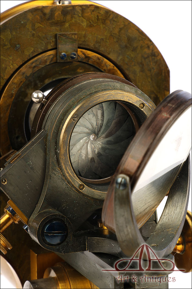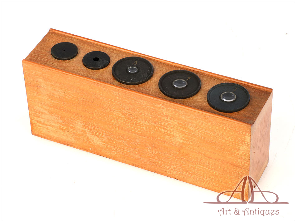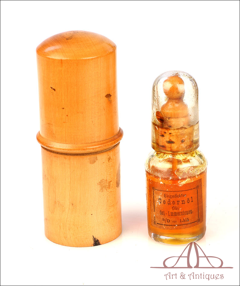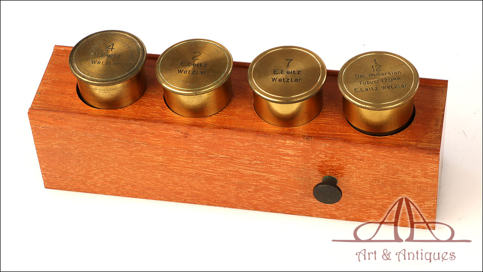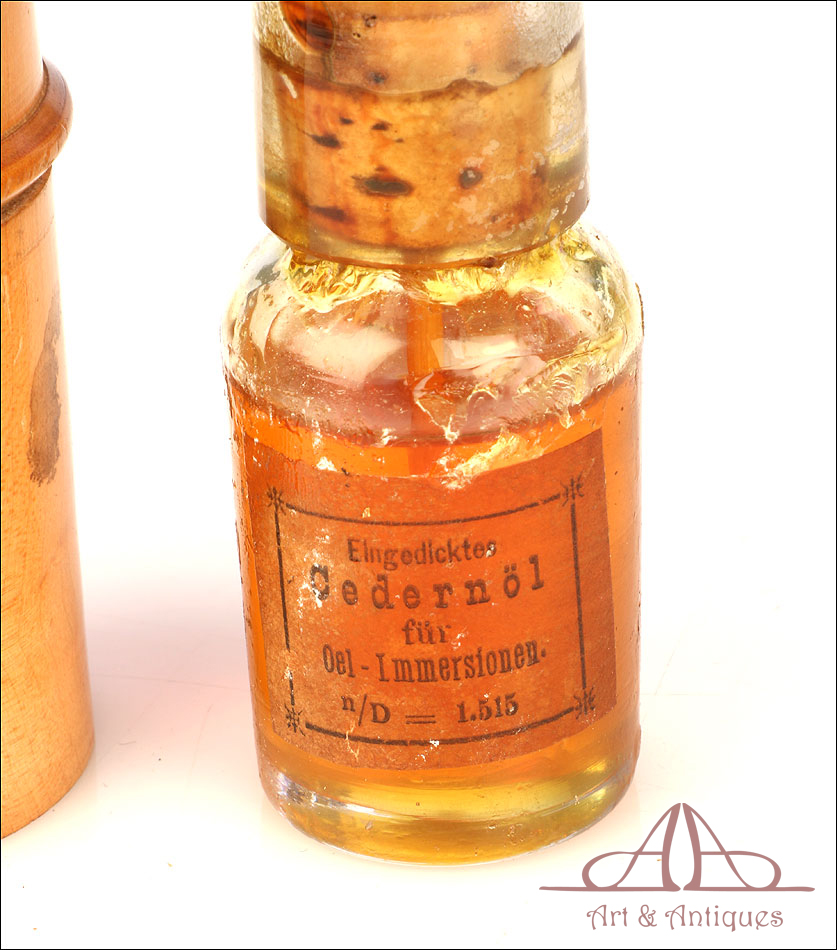 El microscopio se presenta en su estuche de madera de caoba original de época y va acompañado de un completo juego de accesorios, formado por cuatro oculares y cuatro objetivos. En el interior del estuche encontramos las especificaciones de fábrica, según las cuales el microscopio está completo. Lleva revólver de tres lentes, cremallera en perfecto estado de funcionamiento y sistema de ajuste fino muy bien conservado. Todas las piezas y componentes del microscopio funcionan muy bien y se mueven de manera fluida y suave. El juego de accesorios se acompaña de un frasco de aceite para los objetivos de inmersión en aceite.