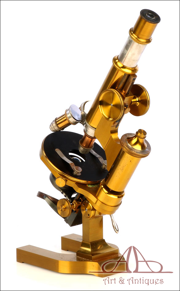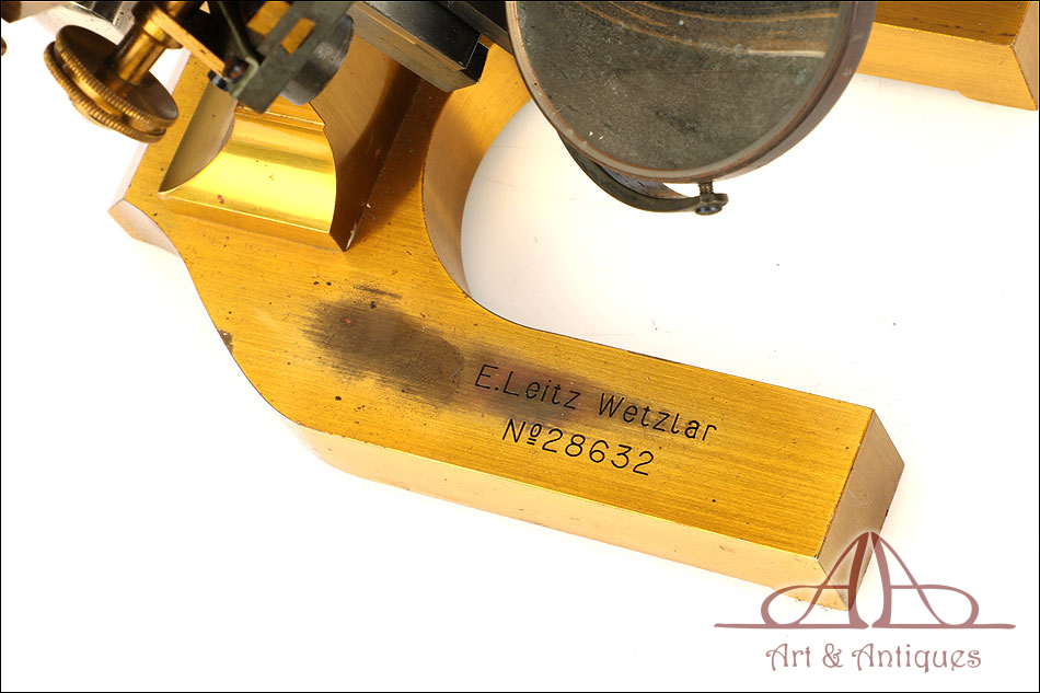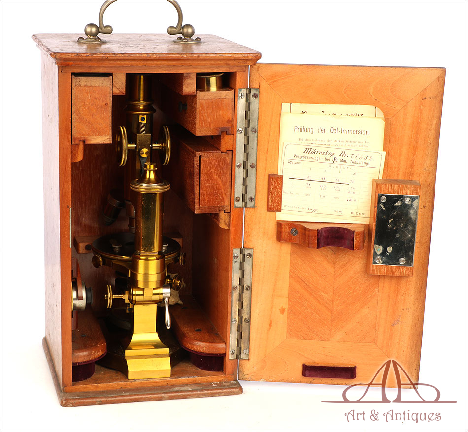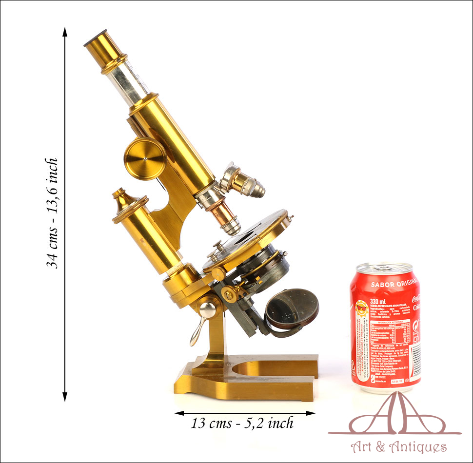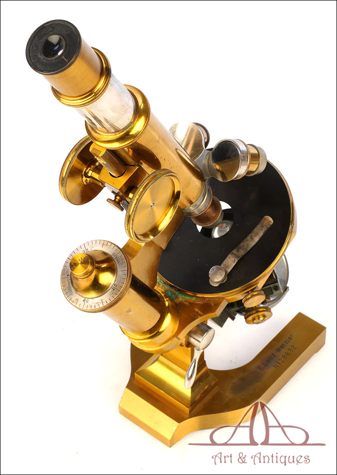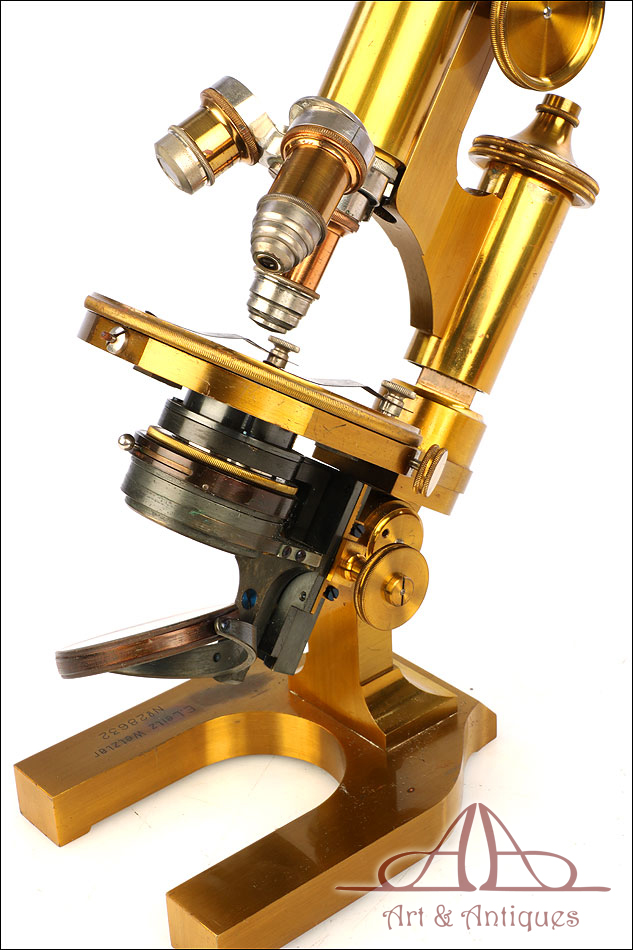 Fantástico microscopio antiguo de Latón E. Leitz Wetlzar fabricado en Alemania en 1893, maravillosamente conservado y en óptimo estado de funcionamiento. El microscopio, un original del siglo XIX obra de la famosa marca alemana, destaca sobre todo por dos factores: su gran tamaño, que indica que se trata de un instrumento de uso profesional, y su impresionante estado de conservación. A pesar de tener más de cien años de antigüedad, el microscopio está como nuevo y funciona de maravilla. Está fabricado íntegramente en latón; el metal conserva el acabado original transparente en fantásticas condiciones, excepto cierto desgaste mínimo en la base. En la base del aparato podemos ver el número de serie Nº 28632 grabado en el metal, número que se repite en el estuche.