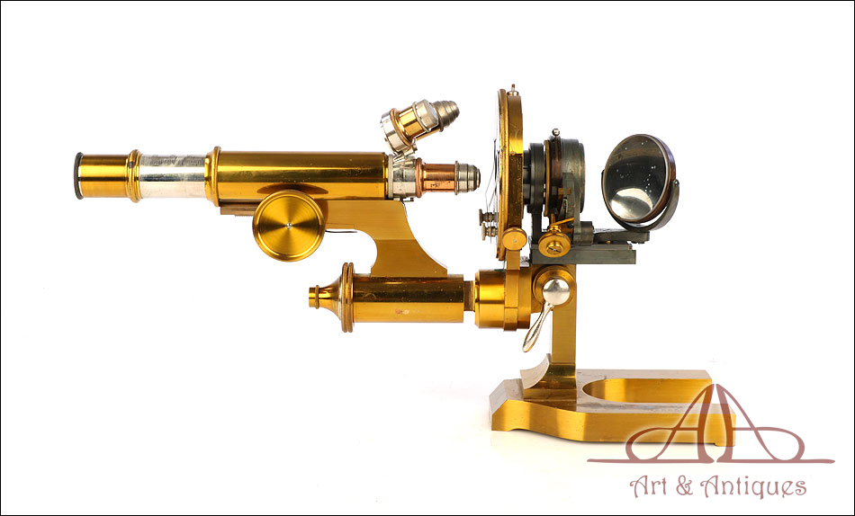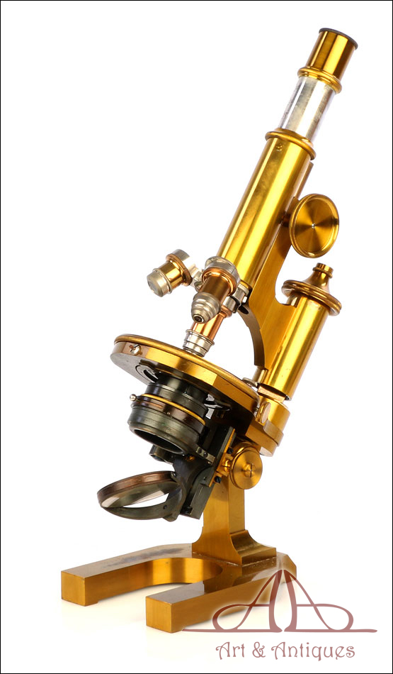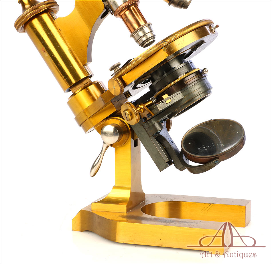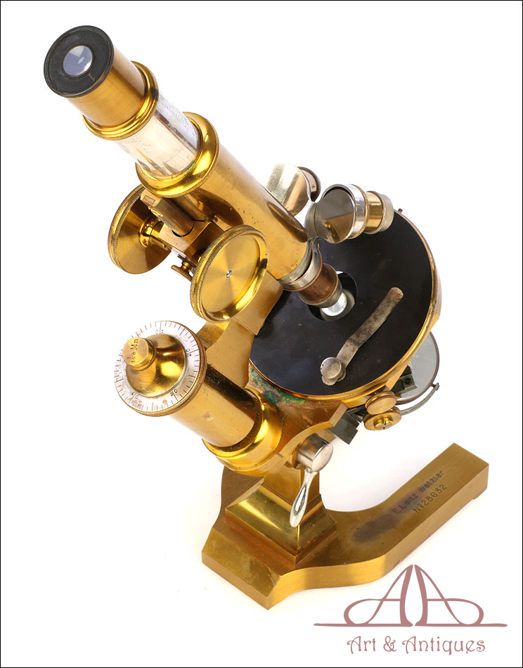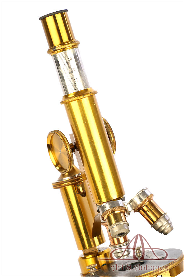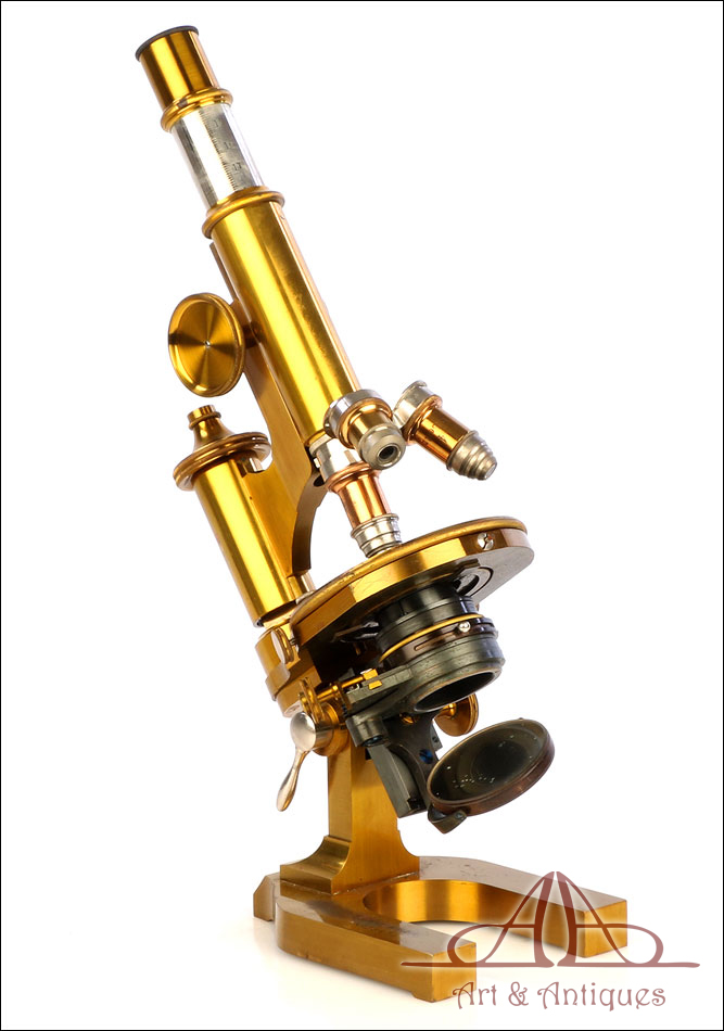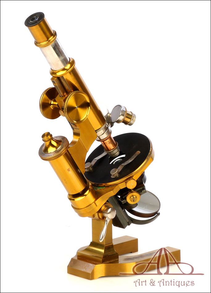 Fantástico microscopio antiguo de Latón E. Leitz Wetlzar fabricado en Alemania en 1893, maravillosamente conservado y en óptimo estado de funcionamiento. El microscopio, un original del siglo XIX obra de la famosa marca alemana, destaca sobre todo por dos factores: su gran tamaño, que indica que se trata de un instrumento de uso profesional, y su impresionante estado de conservación. A pesar de tener más de cien años de antigüedad, el microscopio está como nuevo y funciona de maravilla. Está fabricado íntegramente en latón; el metal conserva el acabado original transparente en fantásticas condiciones, excepto cierto desgaste mínimo en la base. En la base del aparato podemos ver el número de serie Nº 28632 grabado en el metal, número que se repite en el estuche.