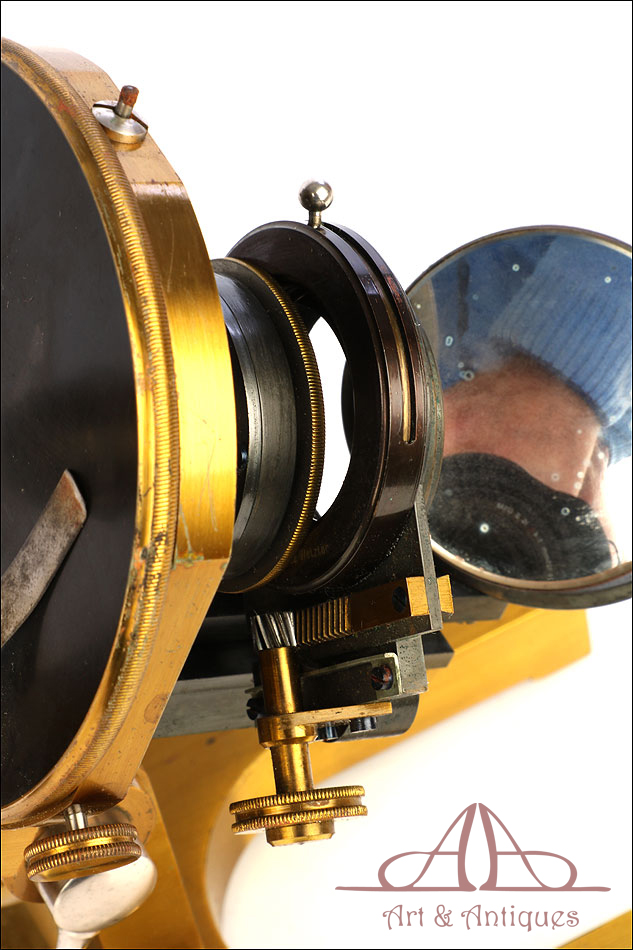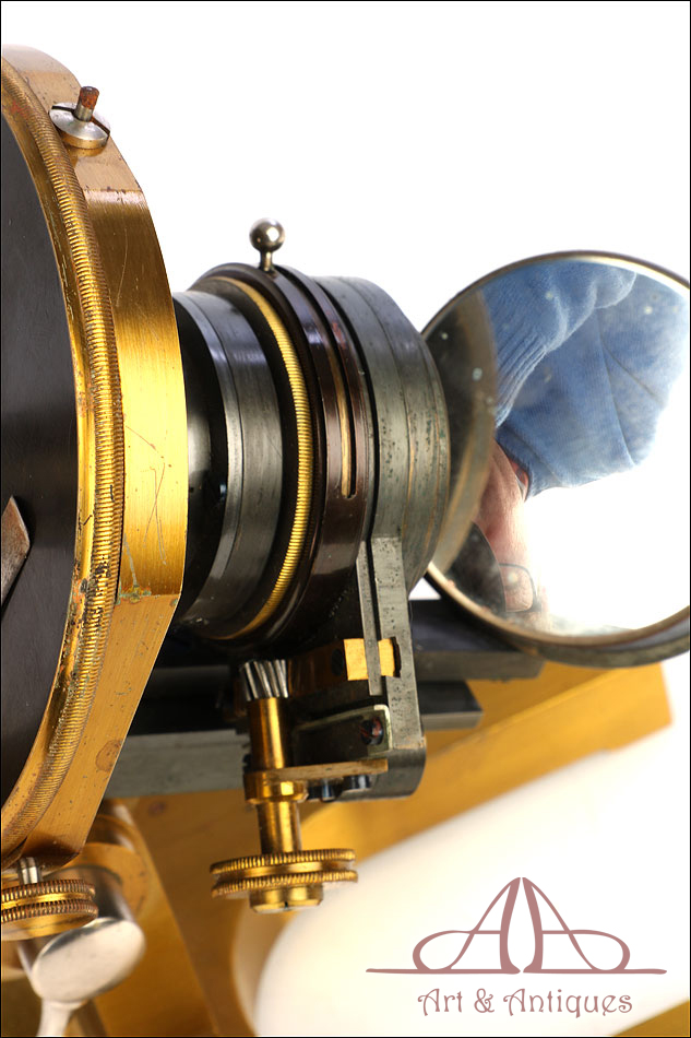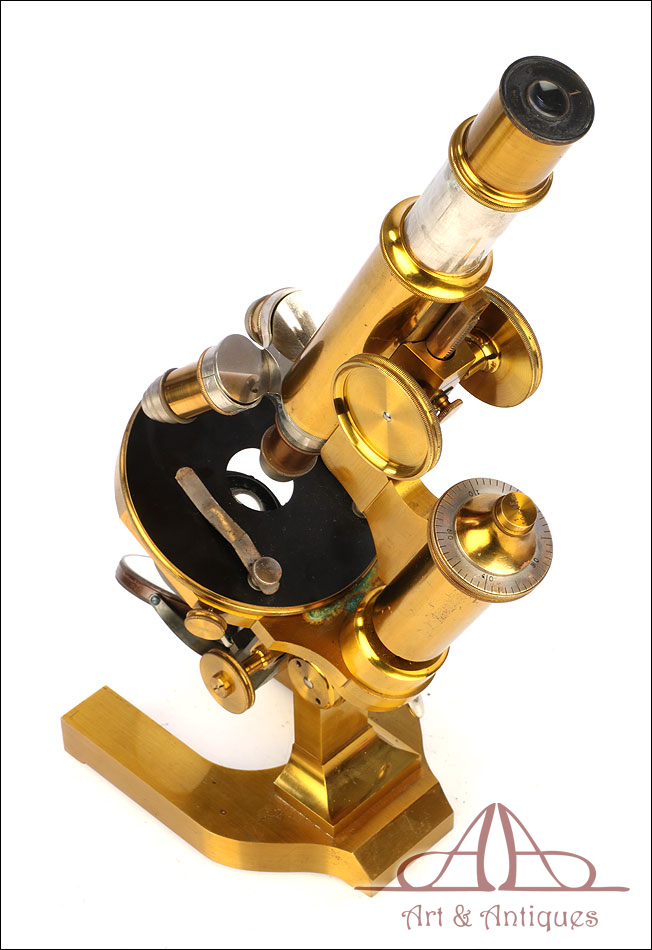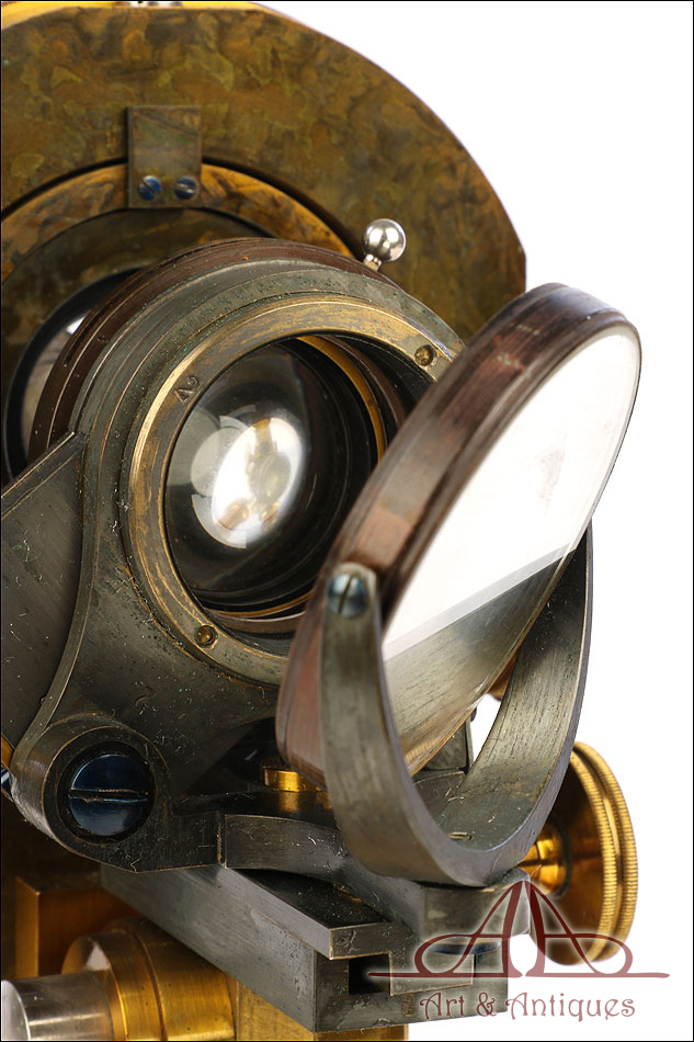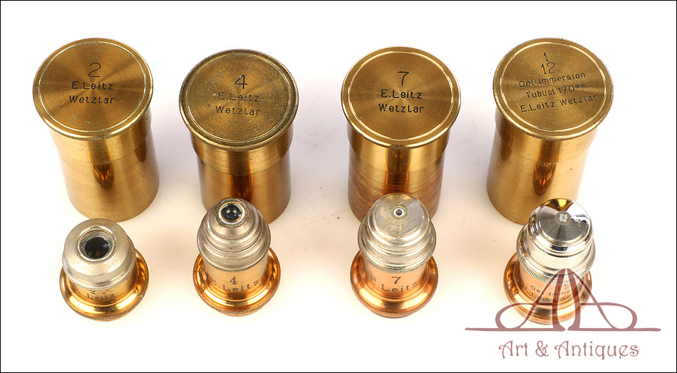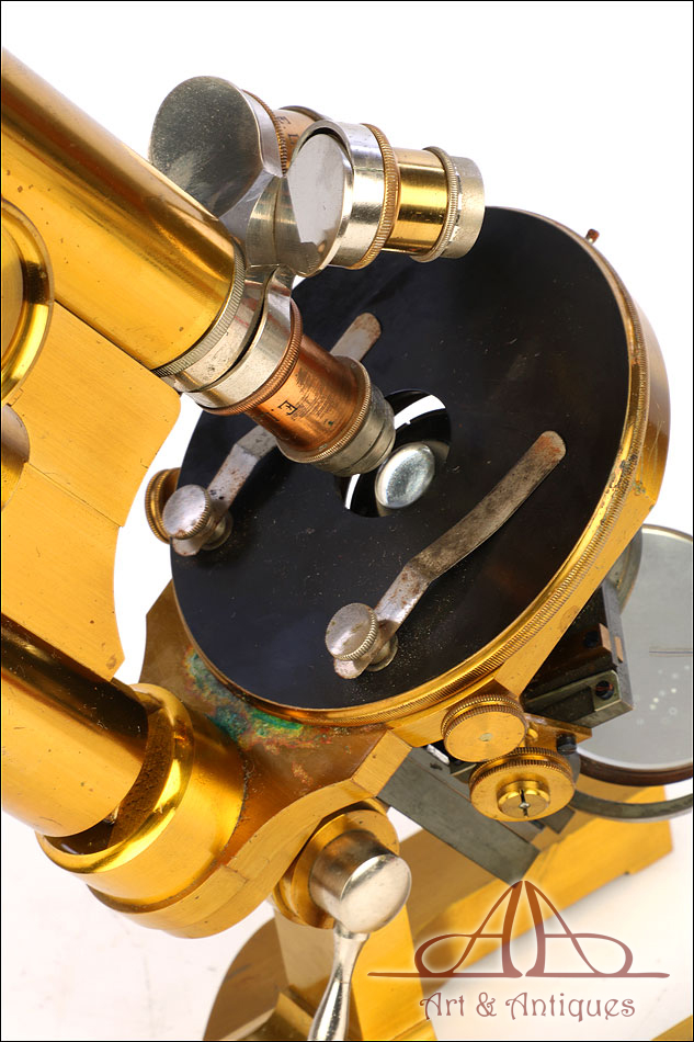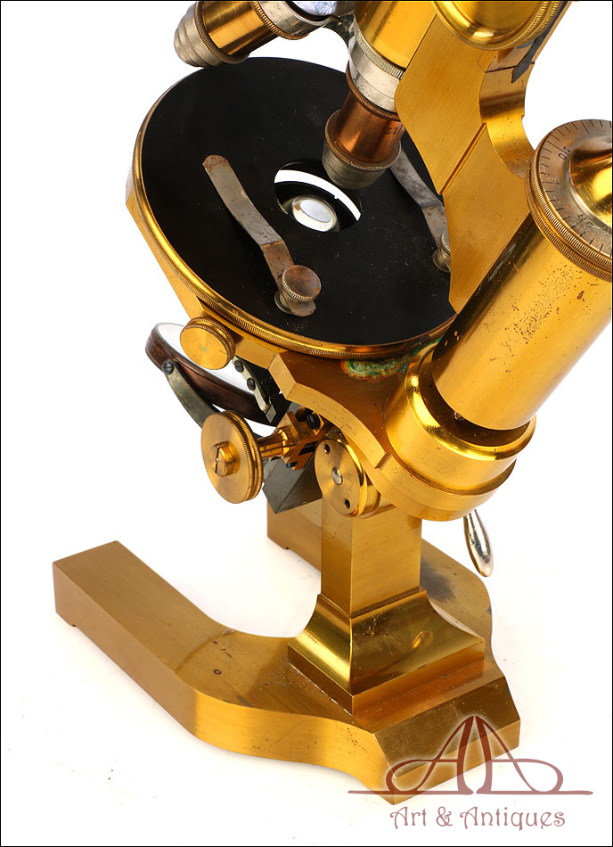 Fantástico microscopio antiguo de Latón E. Leitz Wetlzar fabricado en Alemania en 1893, maravillosamente conservado y en óptimo estado de funcionamiento. El microscopio, un original del siglo XIX obra de la famosa marca alemana, destaca sobre todo por dos factores: su gran tamaño, que indica que se trata de un instrumento de uso profesional, y su impresionante estado de conservación. A pesar de tener más de cien años de antigüedad, el microscopio está como nuevo y funciona de maravilla. Está fabricado íntegramente en latón; el metal conserva el acabado original transparente en fantásticas condiciones, excepto cierto desgaste mínimo en la base. En la base del aparato podemos ver el número de serie Nº 28632 grabado en el metal, número que se repite en el estuche.