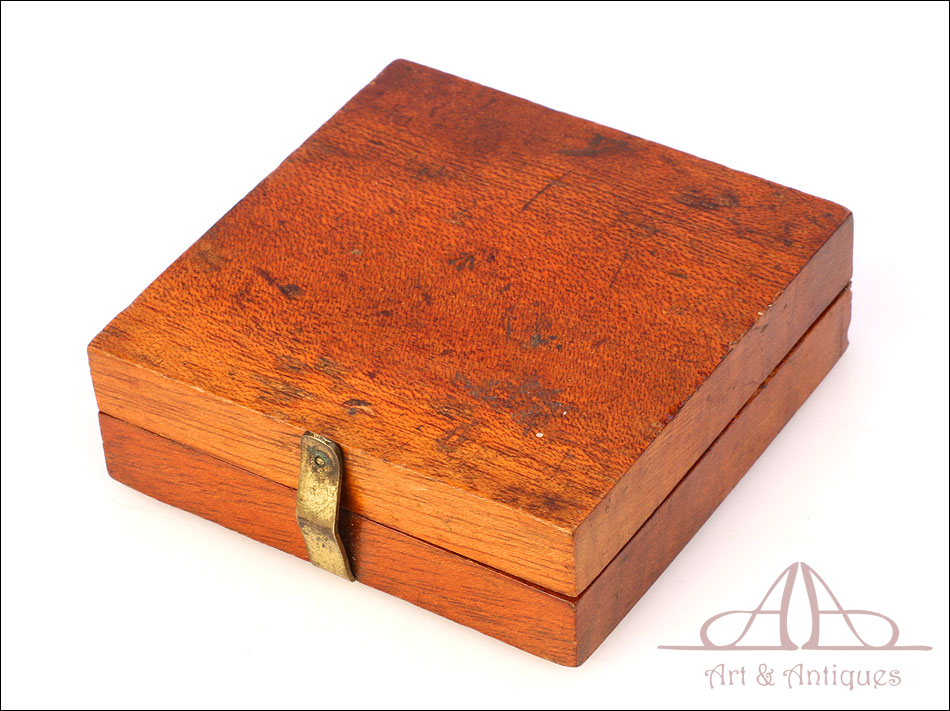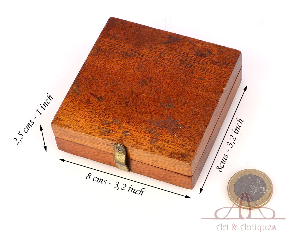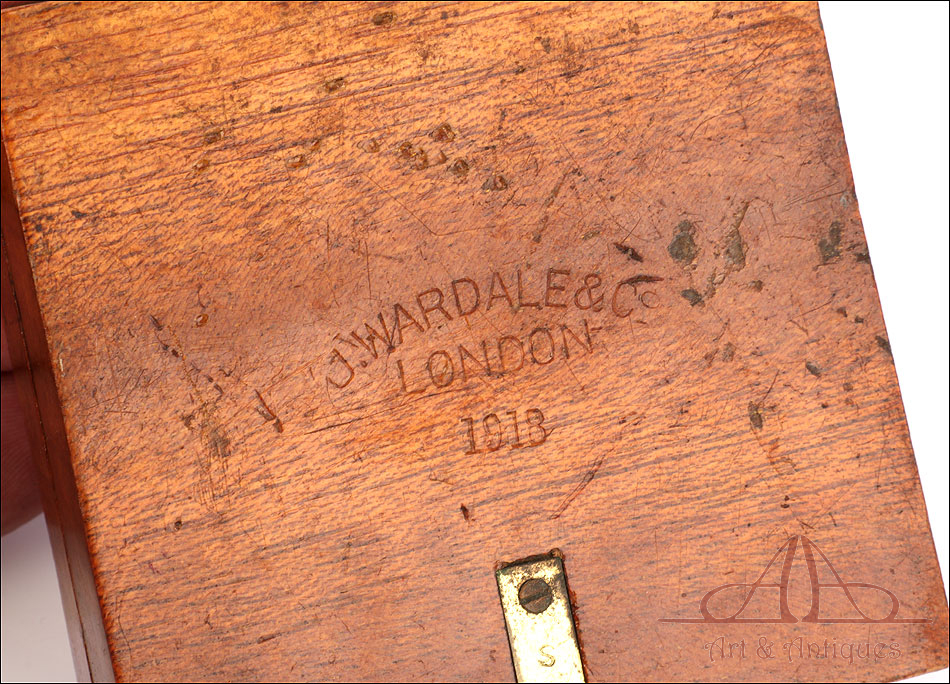 Antigua brújula militar inglesa de la Primera Guerra Mundial, fabricada en el año 1918 y en perfecto estado de funcionamiento. La brújula se conserva en buenas condiciones y mantiene el encanto de las piezas auténticas, con fascinantes y desconocidas historias en su pasado. La caja está fabricada en madera de caoba y muestra el precioso color rojo dorado característico de la especie. Esta madera se empleaba habitualmente en la construcción de instrumentos militares y marinos por su dureza y su resistencia a los cambios de temperatura. En el centro de la tapa podemos ver una pequeña flecha grabada en la madera, señal de que la brújula fue empleada por el ejército británico (se trata de una marca oficial). Si damos la vuelta a la caja encontraremos la inscripción J. WARDALE & CO. – LONDON 1918, con el nombre del fabricante y el año de construcción. La brújula en sí lleva escalas impresas en negro sobre esmalte blanco y herrajes de latón, encontrándose en óptimos estado de funcionamiento.