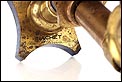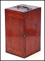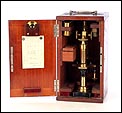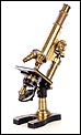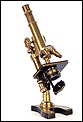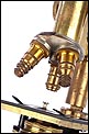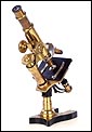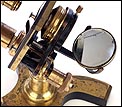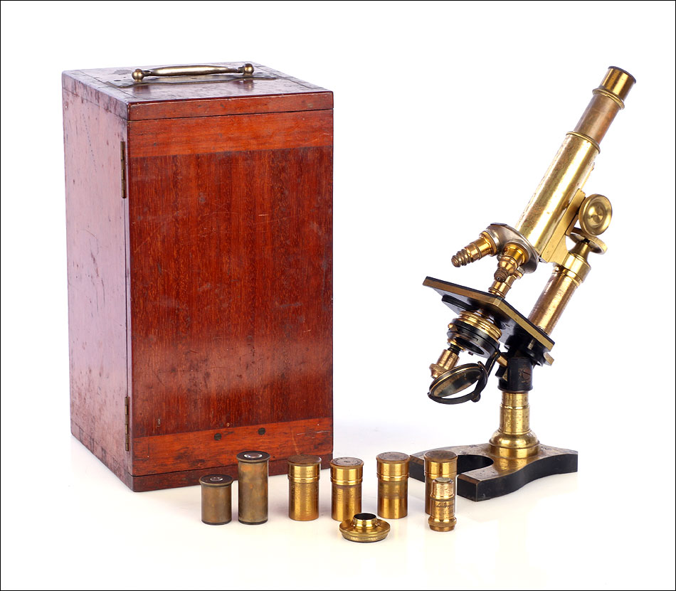 El microscopio tiene base de latón con forma de herradura, en cuya superficie podemos ver grabado el nombre y la dirección de del fabricante: NACHET – Rue St. Severin 16, Paris. Sobre la base se alza un mástil corto que soporta el mecanismo superior. Este consta de una torre con revólver de tres lentes y una pletina para muestras de hierro esmaltada en negro. Salvo esta pieza, el diafragma y el espejo de doble cara, el resto del microscopio es de latón. Los tornillos y engranajes funcionan bien, con un movimiento fluido y suave que hace de su manejo un placer para el usuario. El estuche de madera de caoba maciza es también original de época y está muy bien conservado. Además del microscopio, en su interior encontramos los objetivos y oculares que acompañan a este; los objetivos van en sus respectivas fundas de latón y están grabados con el nombre del fabricante.