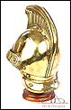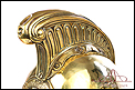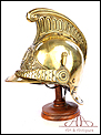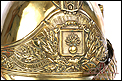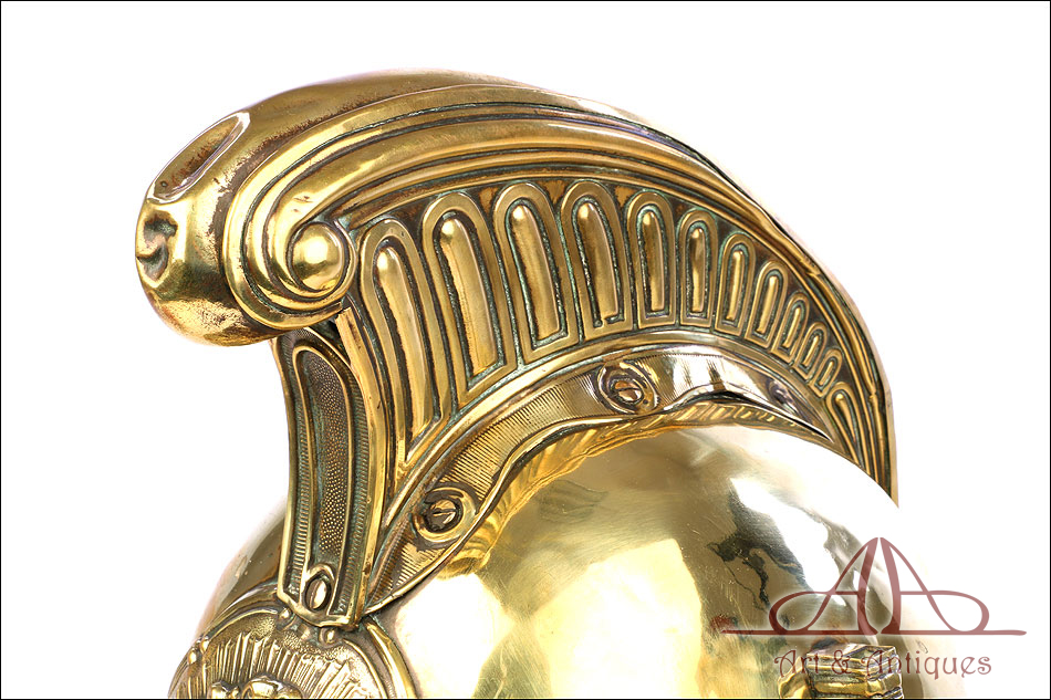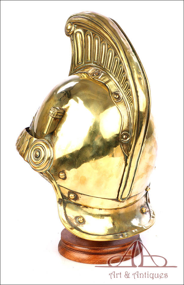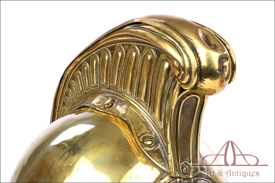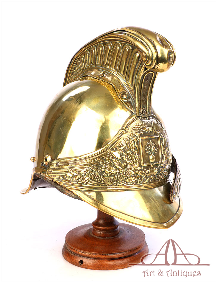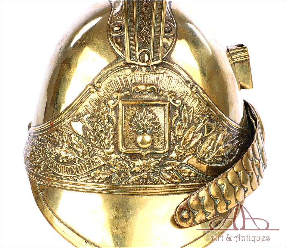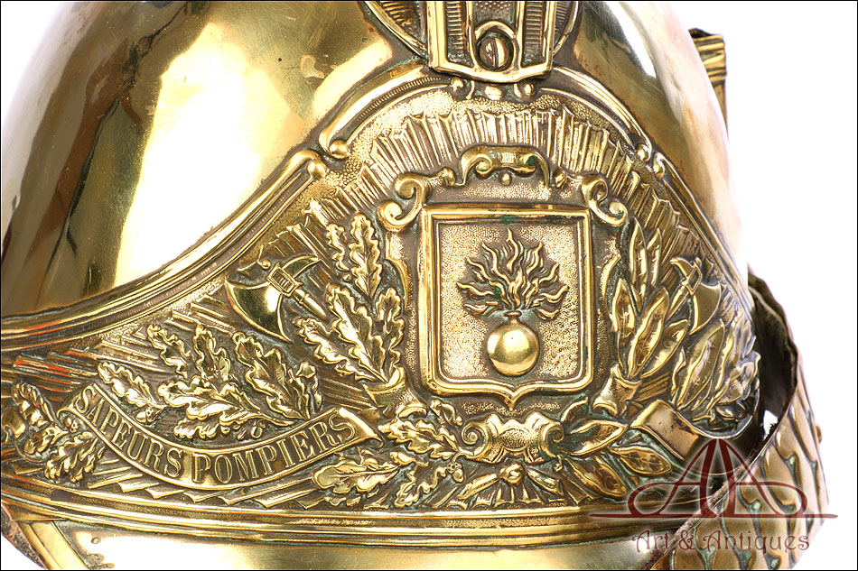 Espectacular y antiguo casco de bomberos francés de latón, fabricado a finales del siglo XIX (circa 1880) y en muy buen estado de conservación. El casco está completo salvo por la pieza lateral izquierda, pareja simétrica de la que se conserva a la derecha y que va decorada con un motivo de escamas. El resto del artículo está en magníficas condiciones y muestra una hermosa decoración. En la parte superior hay un llamativo penacho de latón fijado al casco mediante remaches del mismo material, que le aporta altura y nobleza. La parte frontal sobre la visera lleva en el centro un escudo con la imagen de una botella redonda, de cuya boca salen llamas. El escudo está rodeado de hojas de roble y hojas rectas, entre las cuales distinguimos dos hachas. A la izquierda destaca la inscripción SAPEURS POMPIERS (bomberos zapadores). El interior del casco conserva parte del forro de piel, desgastado por el uso y el paso del tiempo pero totalmente original.
