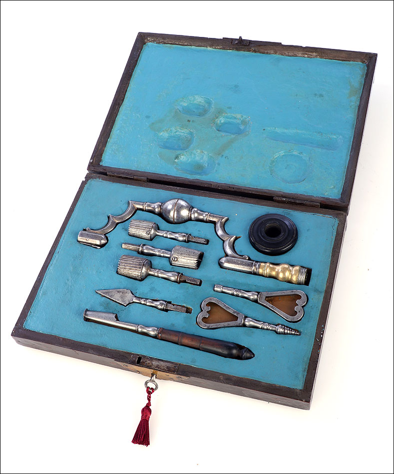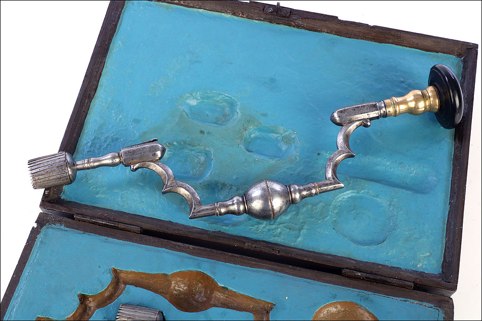 Los coleccionistas de antigüedades relacionadas con la profesión médica encontrarán todo un hallazgo en este antiguo estuche médico de trepanación del año 1730, completo y en fantástico estado de conservación.