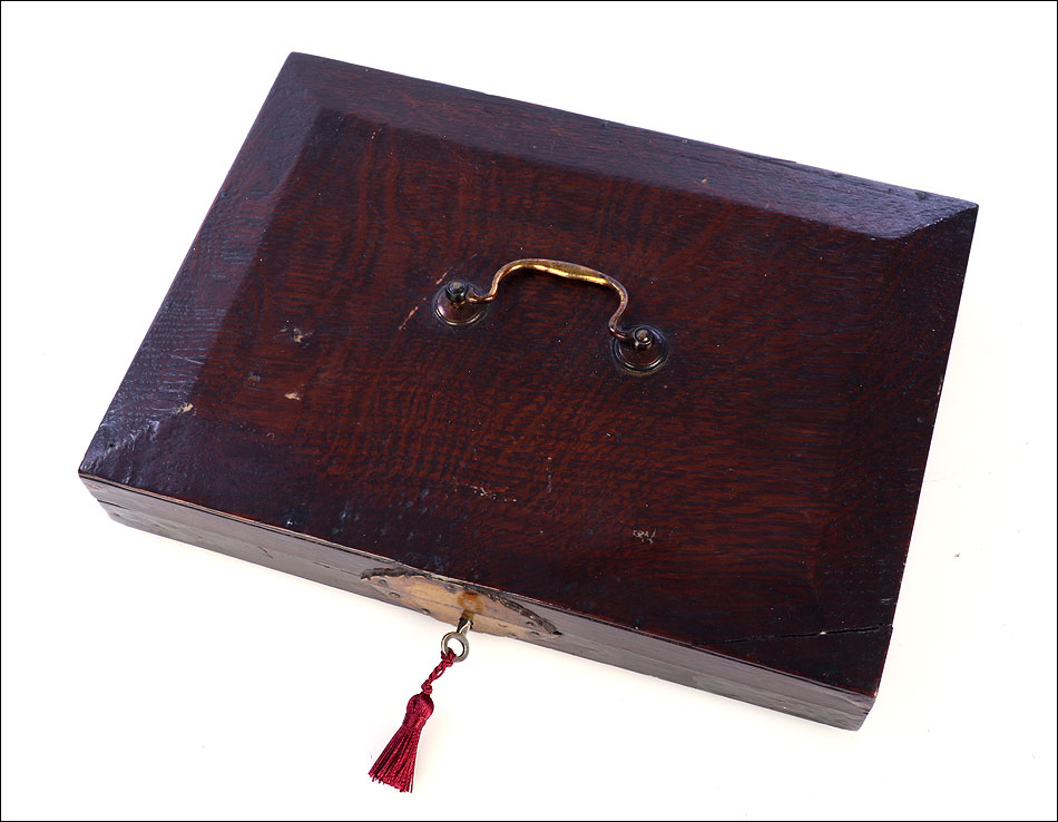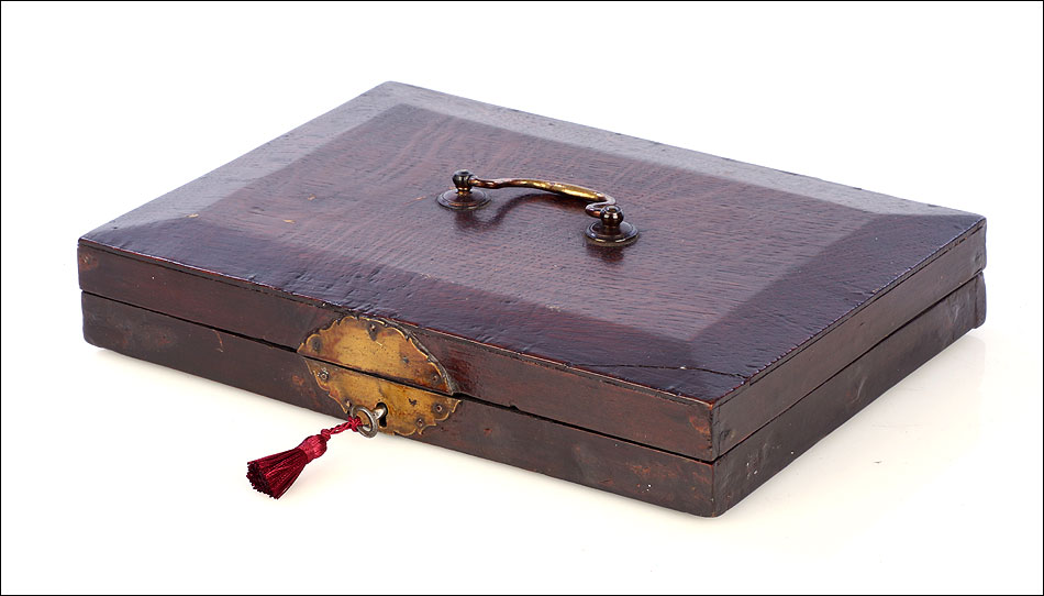 Muy antiguo estuche médico de trepanación del año 1730, fabricado en Francia y con todos los útiles y herramientas en buen estado. El estuche es de madera de roble maciza y ha sido restaurado. Lleva un barniz a muñequilla en tono nogal oscuro que le aporta a la madera profundidad y encanto. La cerradura y la llave son originales de época y se encuentran en estado de funcionamiento. Si abrimos el estuche, en el interior encontraremos el instrumental de trepanación descansando sobre una base pintada en color celeste. Cada herramienta tiene un hueco con su forma, para poderlas transportar de manera ordenada sin que se desplacen o estropeen. El set de instrumentos está formado por un trepanador, una base de apoyo, brocas de corona para perforar, punzones y espátulas. El trepanador lleva grabado el nombre MILLOT. Los útiles son de acero y muestran un aspecto sólido y poderoso, habiéndose conservado en magníficas condiciones hasta nuestros días.