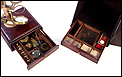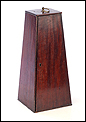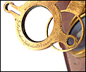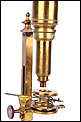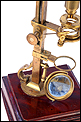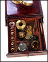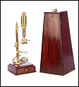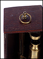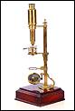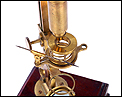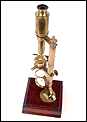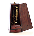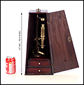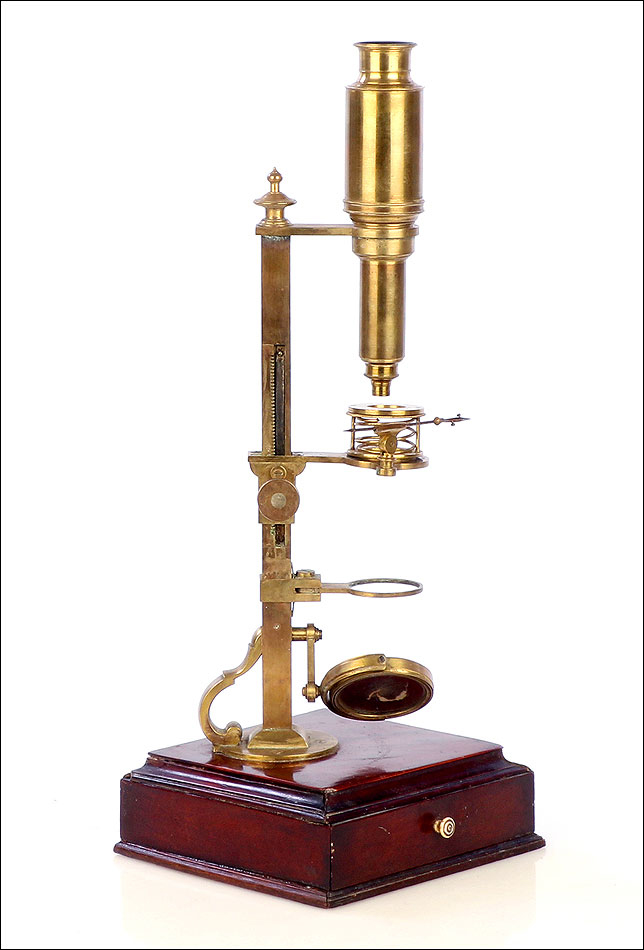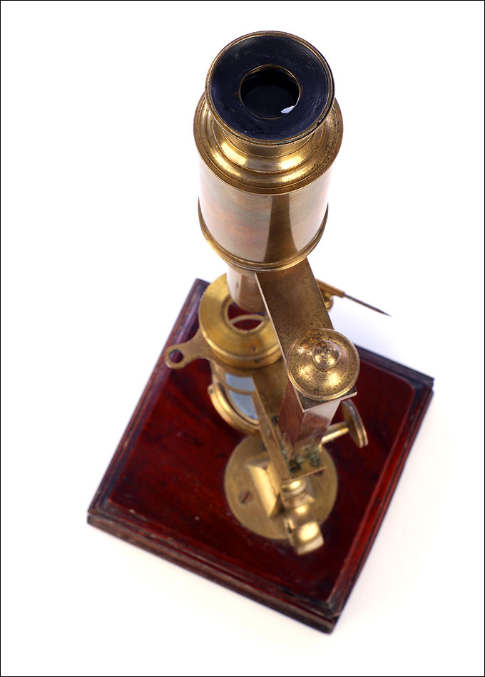 En la pletina del microscopio podemos ver el nombre y la dirección del fabricante grabados a mano en elegante letra cursiva: G. Richardson, Leadenhall St., LONDON. El aparato se alza sobre una base de cuadrada de madera de caoba provista de un pequeño cajón. El cajón está compartimentado y guarda el juego de objetivos y accesorios originales que acompañan al microscopio. En el interior del estuche hay otro cajón destinado a guardar las muestras y el material necesario para prepararlas. El estuche en sí tiene un estilizado diseño con forma de pirámide truncada. Conserva la anilla de latón superior para el transporte y está muy bien conservado, preservando el barnizado a muñequilla original que aporta protección, brillo y profundidad a la madera.