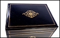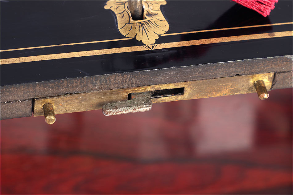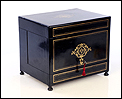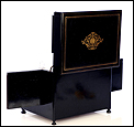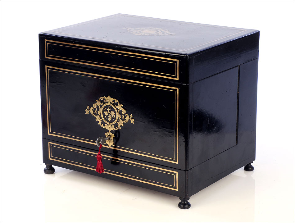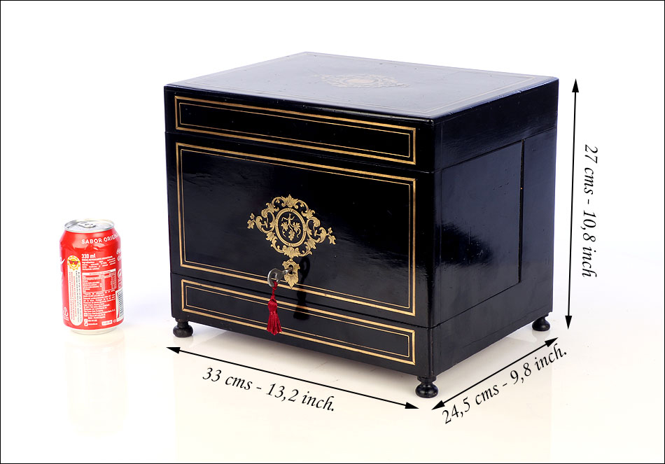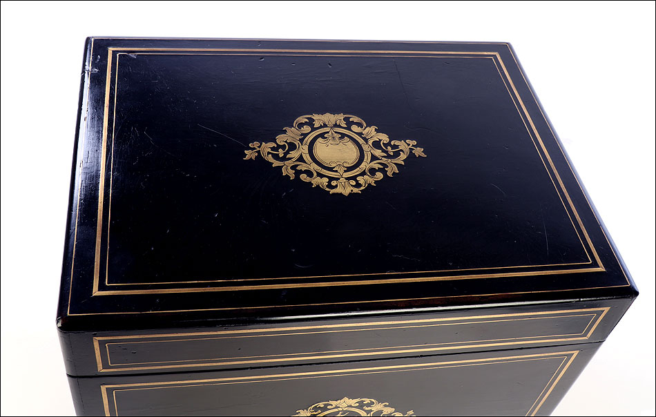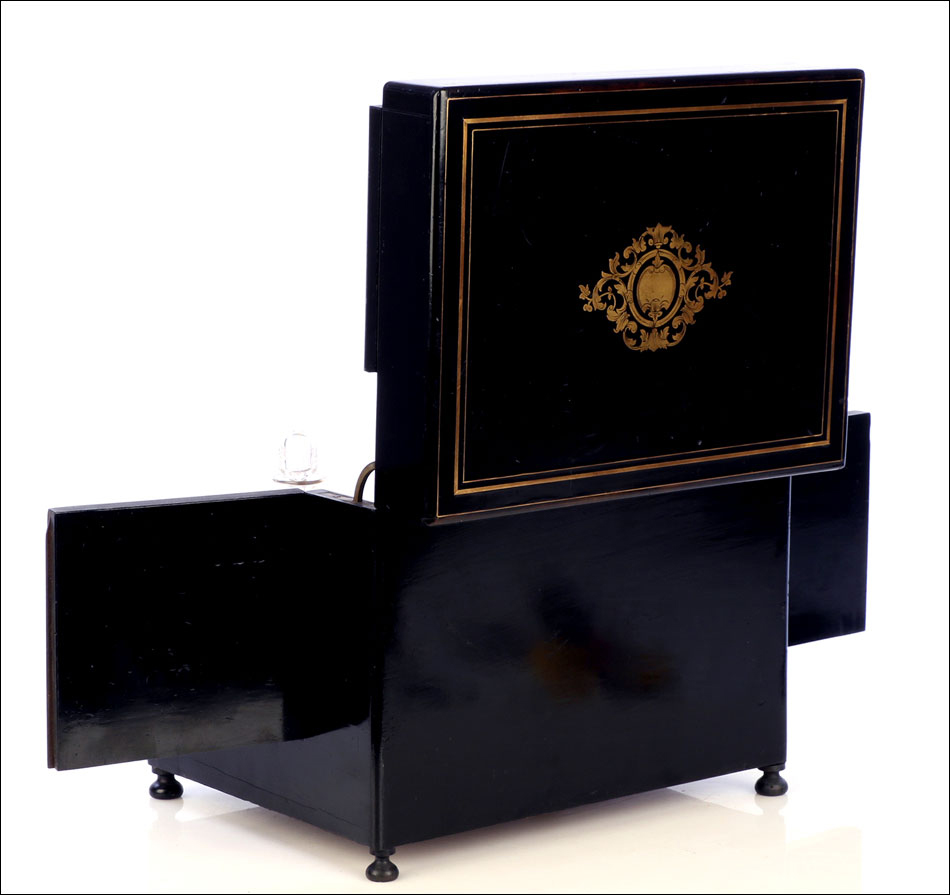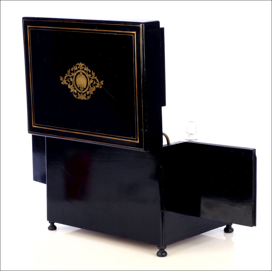 La licorera es de madera maciza y muestra una forma compacta y cuadrada. Se alza sobre cuatro pequeñas patas redondas, con el mismo acabado negro que el resto del mueble. El acabado, un profundo lacado negro brillante, está en un estado de conservación realmente impresionante. Lo mismo podemos decir de los detalles de marquetería que adornan la tapa y el frontal de la licorera. Los detalles son de latón y forman recuadros que enmarcan delicados motivos frontales de estilo pompeyano. Están completos, no faltando ni una de las pequeñas piezas que los componen.