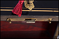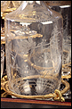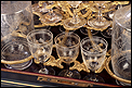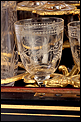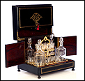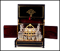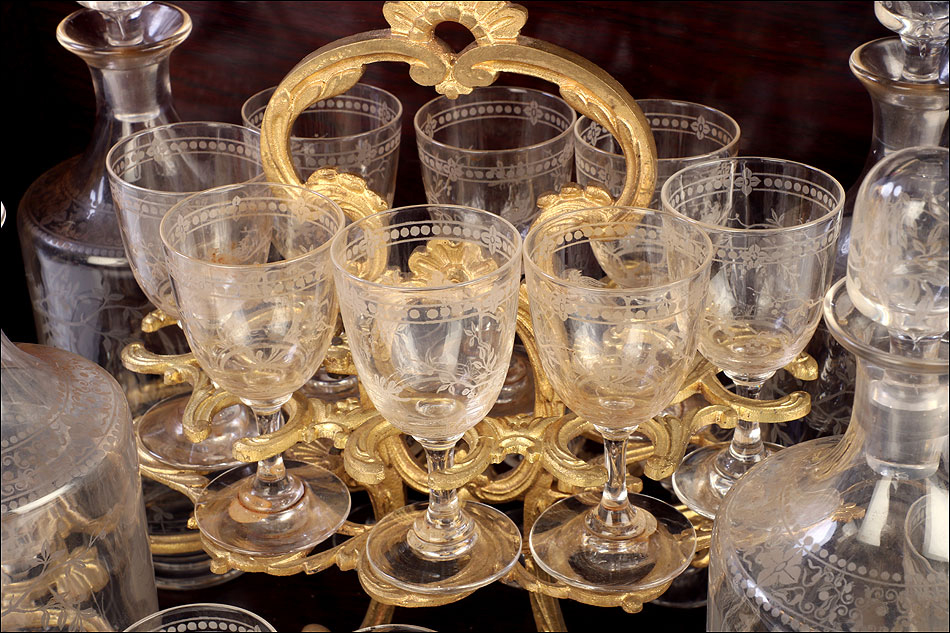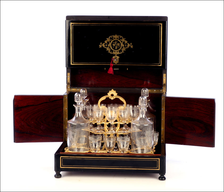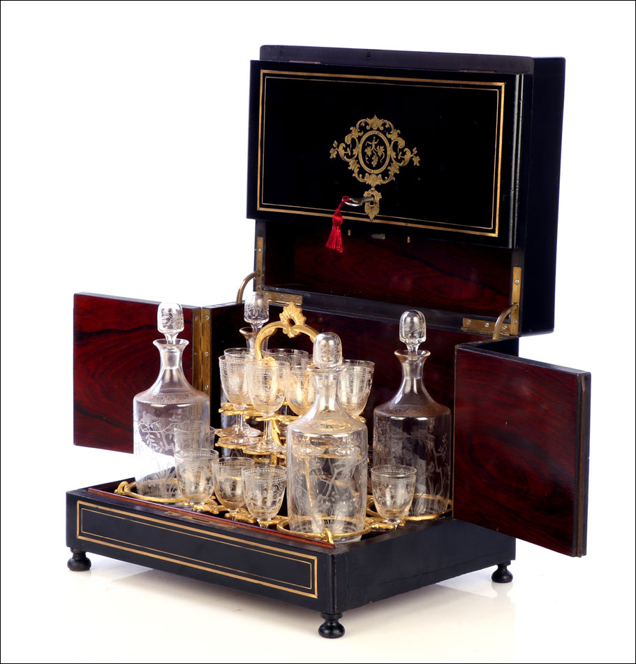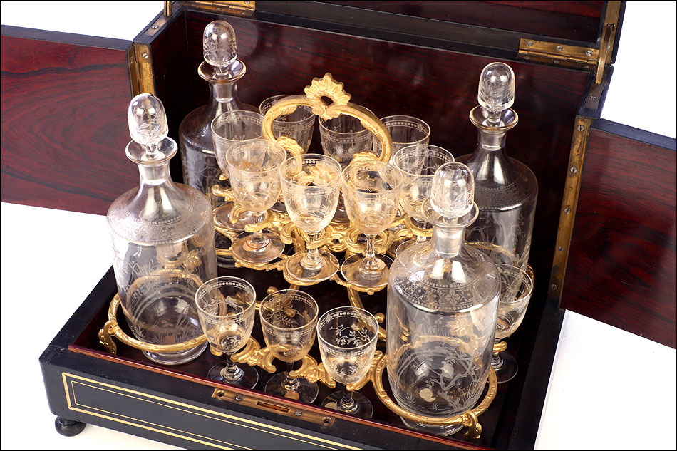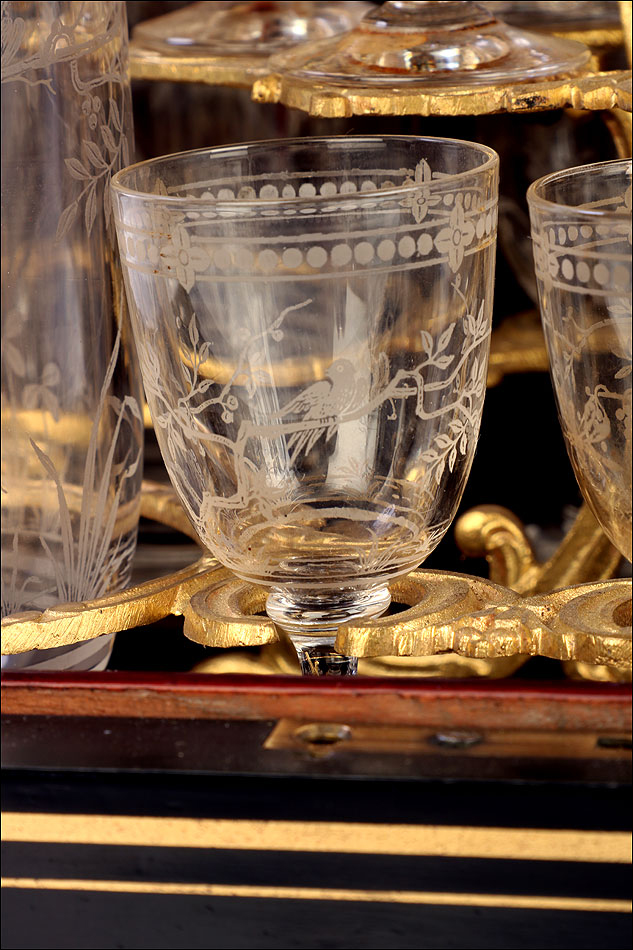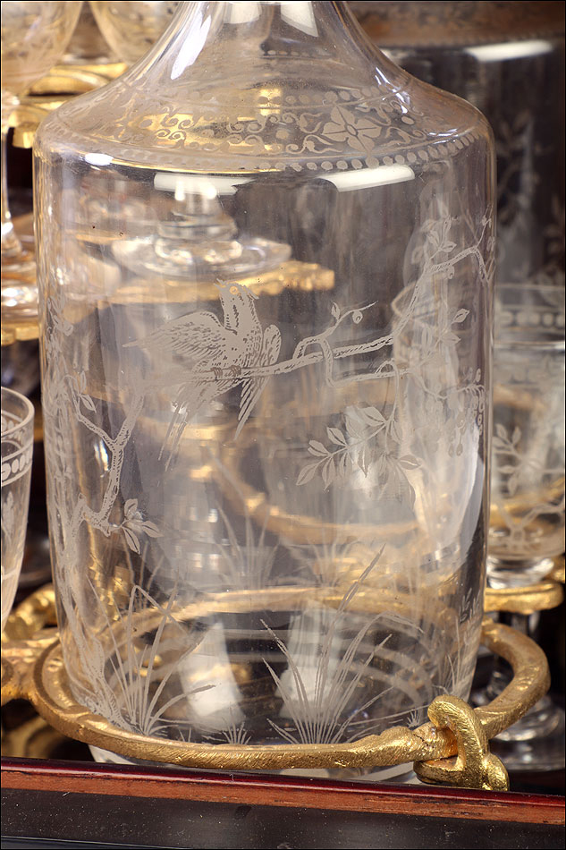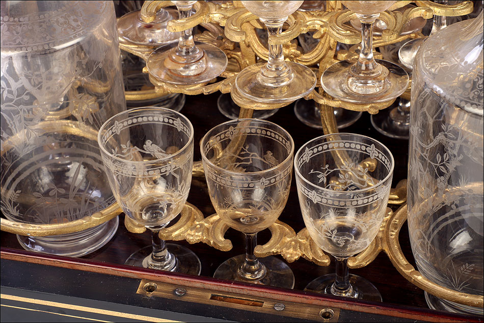 La licorera se abre alzando la tapa, que va a unida al frontal mediante una bisagra. Los laterales también llevan bisagras, abriéndose hacia fuera para mostrar la bellísima cristalería del interior. Por dentro, la madera está lacada con un hermoso motivo que imita la veta de la madera de caoba. La cristalería está formada por dieciséis copas y cuatro botellas, decoradas con motivos de pájaros y flores tallados a mano. Van colocadas en un soporte de latón dorado original y conforman un conjunto bellísimo, sumamente delicado. Muchas de las piezas conservan pequeñas etiquetas redondas en la base con la inscripción BACCARAT FRANCE.