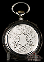 La esfera es de plata maciza con detalles florales grabados y dorados. Es un diseño de gran belleza, complicado y muy decorativo. Lleva números romanos negros y agujas de pica, una de ellas pavonada (la del calendario semanal). La corona que rodea a la esfera está decorada con volutas grabadas a mano, un detalle que aumenta el potencial estético del reloj. La tapa trasera, también de plata maciza, está decorada con un sencillo y encantador motivo grabado a mano formado por un grupo de flores a la derecha y un paisaje con una casa a la izquierda. El paisaje crea una lograda sensación de lejanía y profundidad. En el centro hay un escudo liso, sin grabar.