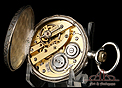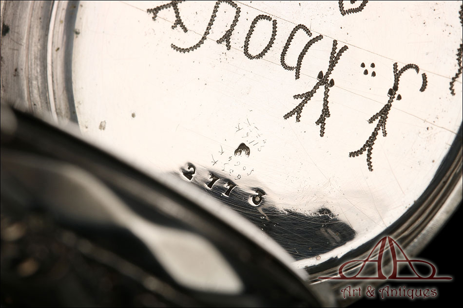 Si levantamos la tapa trasera, en su interior encontraremos un contraste con la imagen de un cangrejo. Se trata de un antiguo sello francés que identifica artículos de plata de pequeño tamaño. Junto con el sello podemos ver una inscripción grabada a mano con punzón, que corresponde al nombre de un antiguo propietario, y el número de serie 2773. En el interior de la tapa guardapolvo descubrimos de nuevo el contraste del cangrejo. Bajo ella, la maquinaria destaca por su limpieza y precisión.