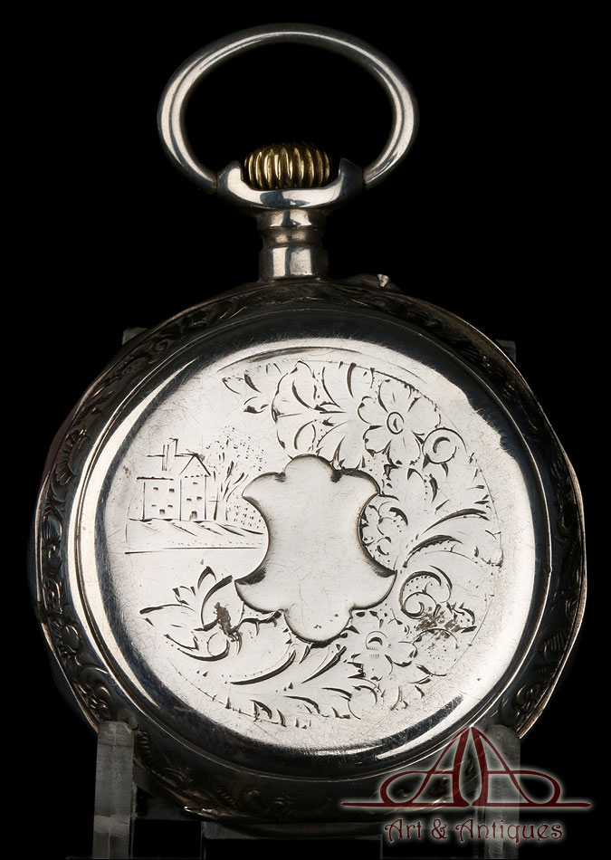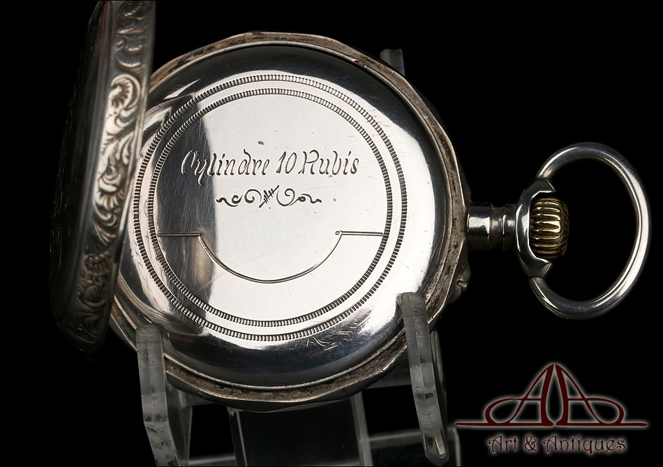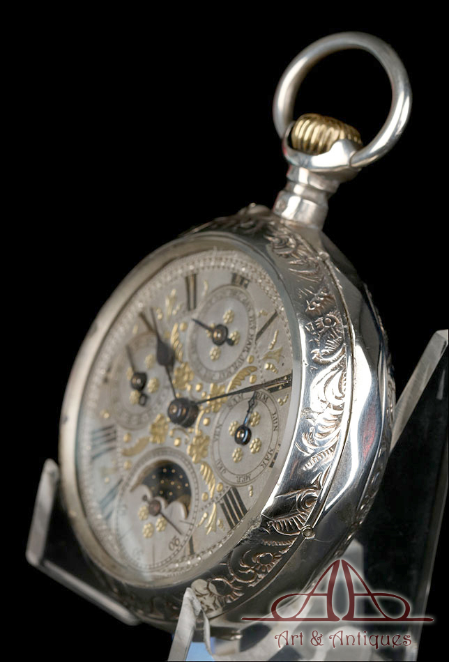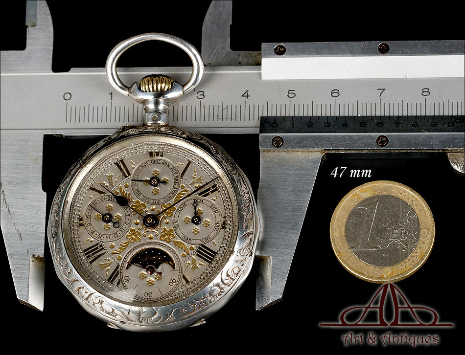 Antiguo Reloj de Bolsillo con Calendario y Fase Lunar en Plata Maciza. Francia, Circa 1880 |