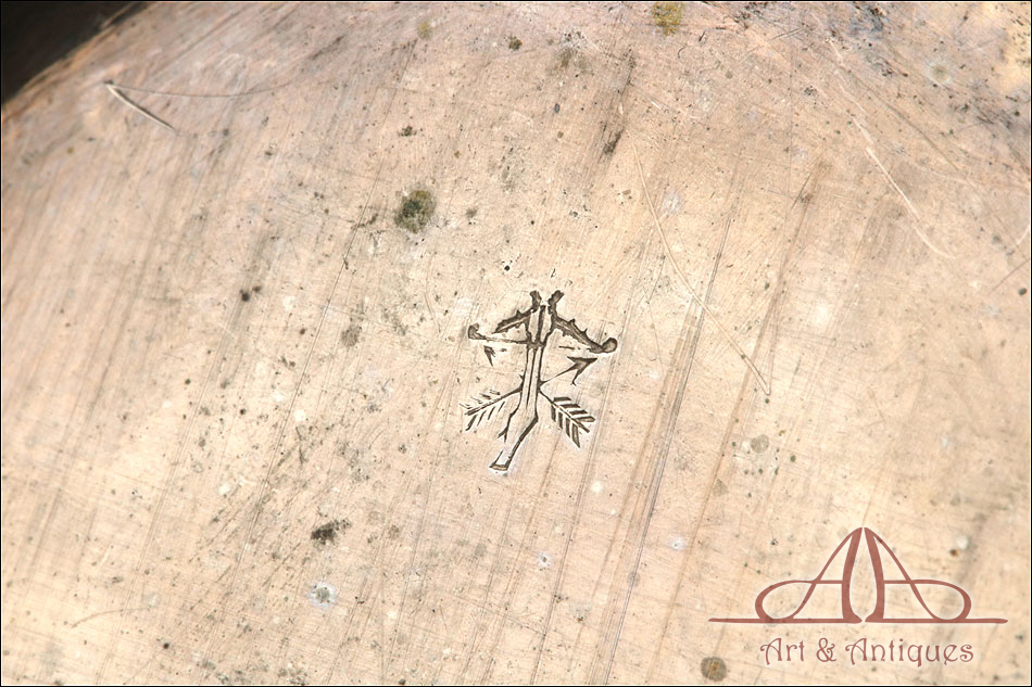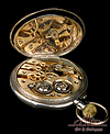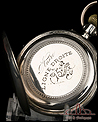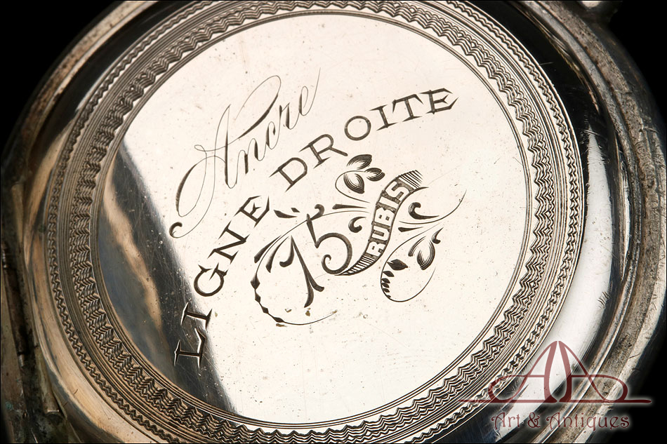 Debajo de esta pieza aparece la tapa guardapolvo, también de plata y diseñada para proteger la maquinaria. Lleva una bella inscripción grabada a mano, que describe en francés la maquinaria e indica que incluye 15 rubíes. La inscripción combina distintos tipos de letra, todos bellamente ejecutados, y va acompañada de un sencillo detalle ornamental. En el interior de la tapa trasera encontramos un contraste con forma de ballesta, con dos flechas cruzadas.