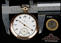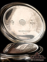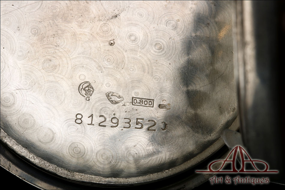 La esfera blanca, protegida por la tapa de vidrio original, lleva números arábigos negros y manecillas rectas de metal dorado. El nombre OMEGA aparece impreso en letras negras, claramente visibles. La tapa trasera está decorada con fondo en guilloché “grano de avena” y escudo central sin grabar, todo ello realizado a mano. Si la levantamos, en su interior encontraremos varias marcas e inscripciones: el nombre y logotipo de la marca, el gramaje de la plata (0,800), el número de serie 8129352 y algunos contrastes. Uno de ellos corresponde a la plata alemana, por lo que podemos deducir que el reloj se fabricó para la exportación a este país. Los contrastes aparecen también en la tapa guardapolvo. La maquinaria está marcada con el nombre OMEGA y el número de serie 7720866.