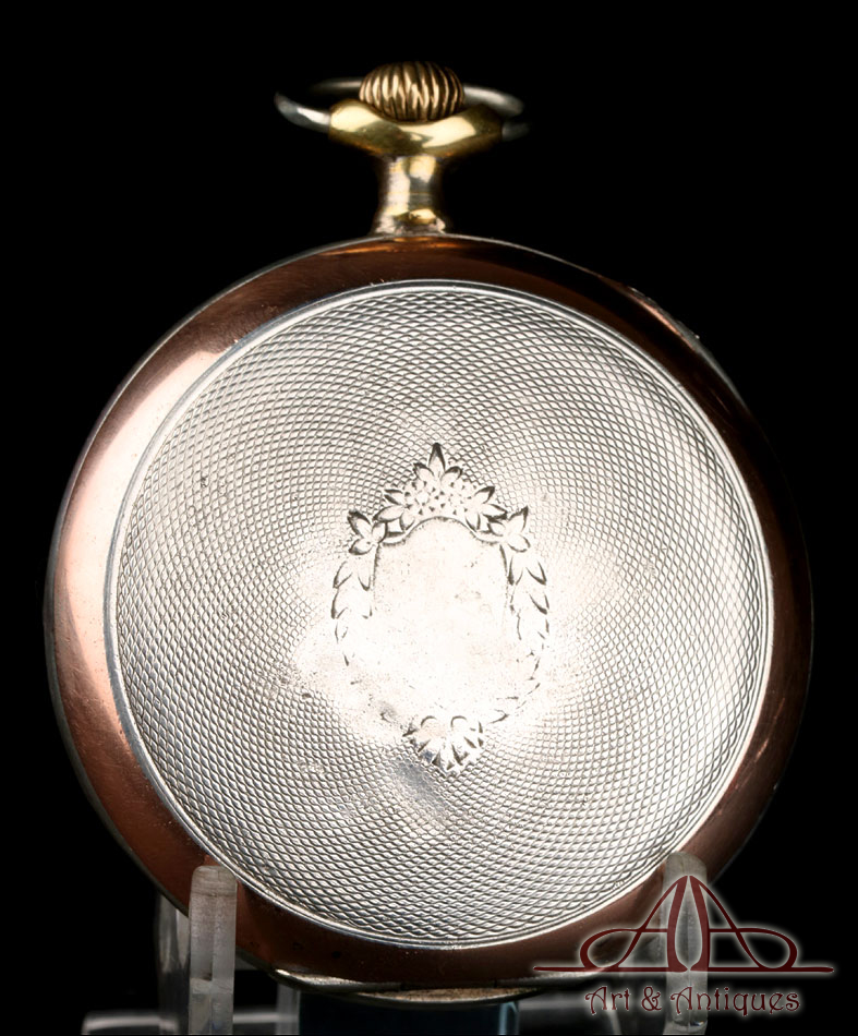 Antiguo reloj de bolsillo Omega en plata maciza, procedente de Suiza y fabricado circa 1920. El reloj destaca por su buen estado de conservación y su magnífico funcionamiento, con toda la calidad que caracteriza a la prestigiosa e histórica marca relojera. La maquinaria está muy limpia y se ha revisado para garantizar su buen rendimiento, de manera que a día de hoy el reloj funciona de maravilla y mantiene la hora a la perfección. La caja de plata maciza combina el acabado liso del metal con algunas zonas chapadas en oro rosado, como la corona que rodea a la esfera y la que enmarca la tapa trasera.