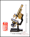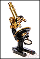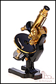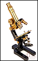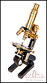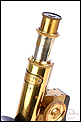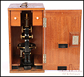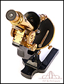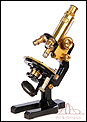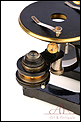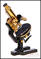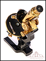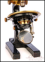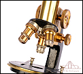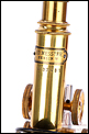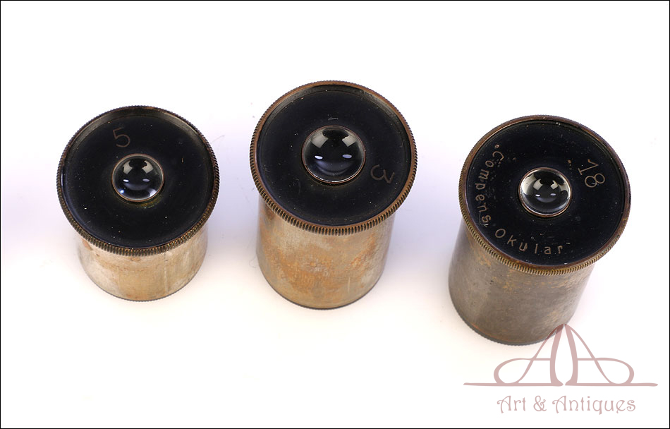 Este hermoso instrumento se presenta en su estuche original de madera de caoba rubia, y va acompañado de un juego de tres oculares y tres objetivos. Los objetivos van montados en el revólver de tres lentes que incluye el microscopio. Este lleva pie de metal esmaltado en negro y parte superior de latón. Tanto el esmalte como el latón están muy bien conservados, sin signos evidentes de deterioro o del paso del tiempo. Las partes móviles (cremallera, tornillos de ajuste, etc.) se mueven con fluidez y suavidad, haciendo del uso del microscopio todo un placer para el coleccionista. Además, la cremallera que permite a la torre deslizarse por el pie está en excelentes condiciones.