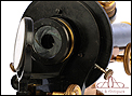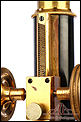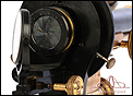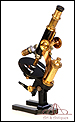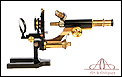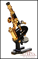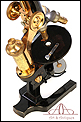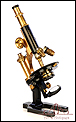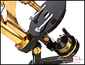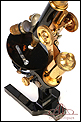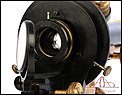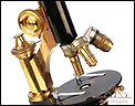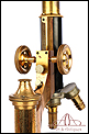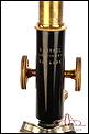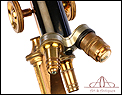 El microscopio combina base, pletina y torre en metal esmaltado en negro con partes de latón. El latón conserva la laca transparente original, que le aporta una pátina muy cálida y atractiva. Tanto el esmalte como el latón están en buenas condiciones, mostrando solo ligeros signos del paso del tiempo que no hacen sino aumentar el atractivo y la personalidad del microscopio. En la torre podemos ver grabado el nombre del fabricante y el número de serie del aparato: R. WINKEL – GÖTTINGEN – Nr. 14498. La cremallera, el sistema de ajuste fino y el diafragman están en perfecto estado de funcionamiento; todos los tornillos y mandos se mueven de forma fluida y suave, haciendo del uso del microscopio todo un placer.