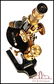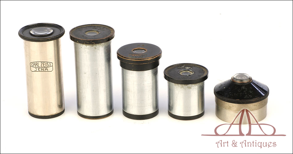 Antiguo microscopio alemán Winkel con ópticas Carl Zeiss, fabricado en Alemania circa 1930 y en buenas condiciones. El microscopio funciona bien, lleva revólver de tres lentes y se presenta en su estuche original de madera de caoba maciza. Va acompañado de un juego de cuatro oculares y tres objetivos firmados por Carl Zeiss Jenna. En los años 30, la empresa Winkel era una sociedad limitada cuyo accionista principal era la firma de Carl Zeiss; por eso, los objetivos y oculares llevan el nombre de la famosa empresa de material óptico.