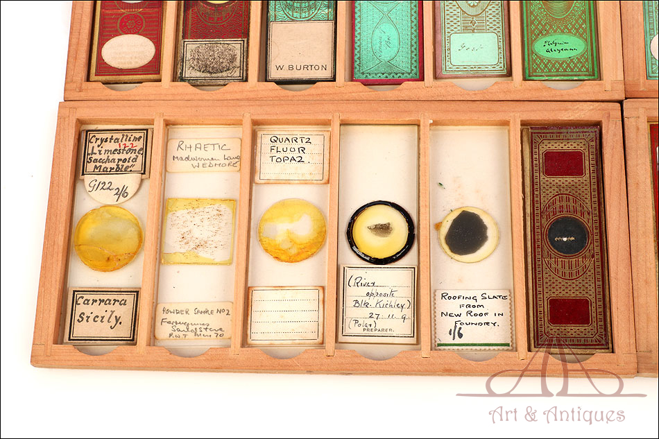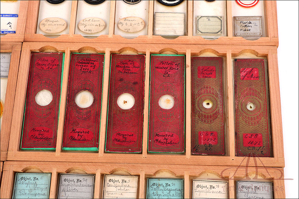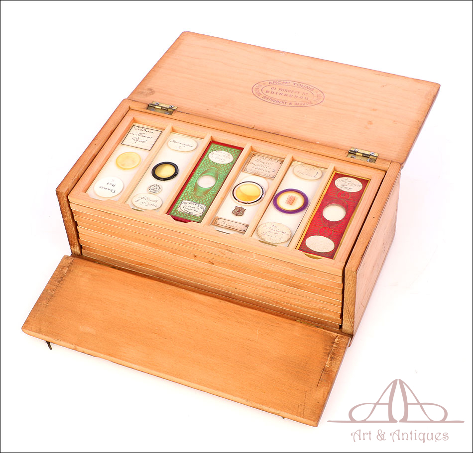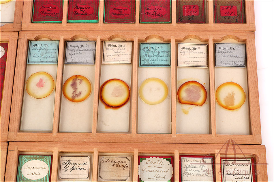 Fascinante colección de 60 preparados antiguos para microscopio de varias épocas y en su estuche original. Los preparados son de épocas muy distintas; algunos están datadoss en el siglo XIX y otros datan de principios del siglo XX, alrededor de 1920 o 1930. El estuche de madera es un pequeño cajón con tapas abatibles superior y frontal, que se abren para poder extraer las bandejas con los preparados. Estos presentan una estética tan variada como su contenido, siendo tan interesantes como bellos. En la colección encontramos muestras de insectos, polen, minerales, plantas, tejidos… Todo tipo de materiales, orgánicos e inorgánicos, cuya visualización con microscopio garantiza horas de entretenimiento. Cada muestra y cada preparado lleva el nombre del contenido escrito a mano en inglés. En el estuche podemos ver también un sello con el nombre del fabricante, ARCHIBALD YOUNG de Edimburgo, Escocia.