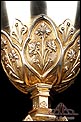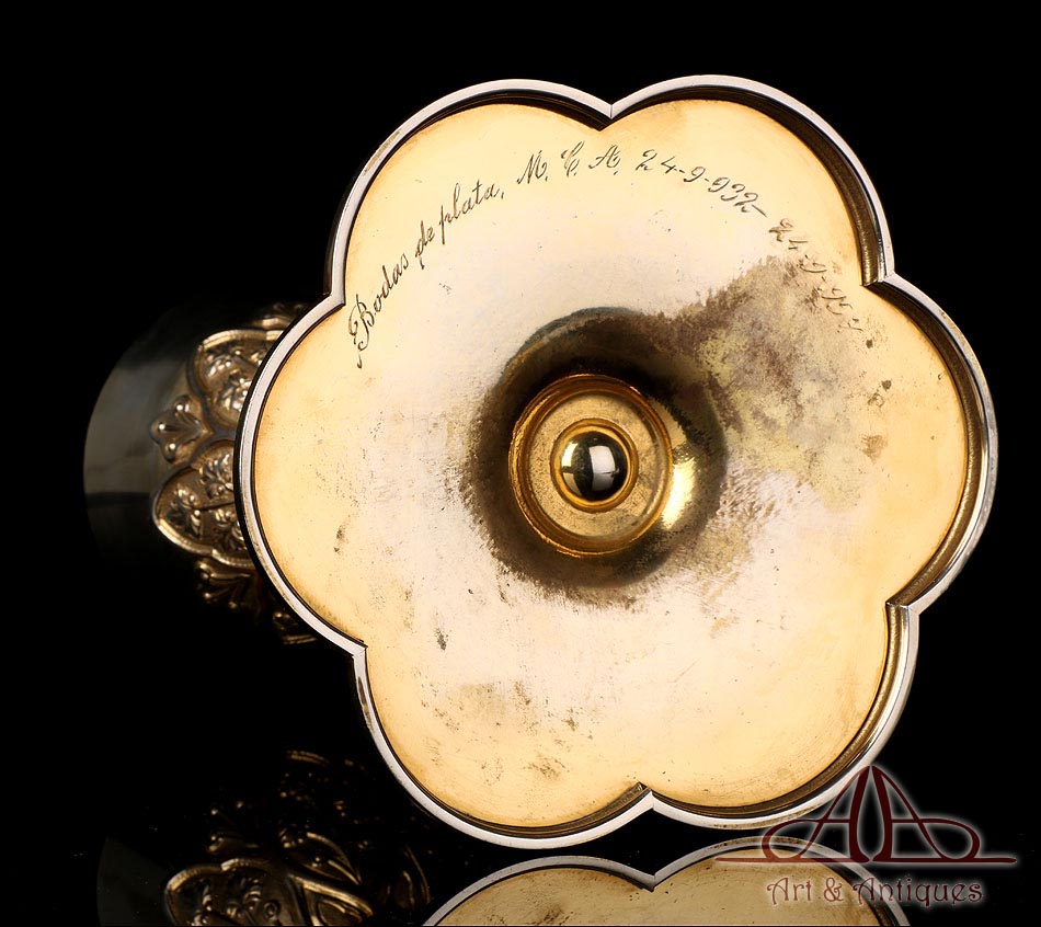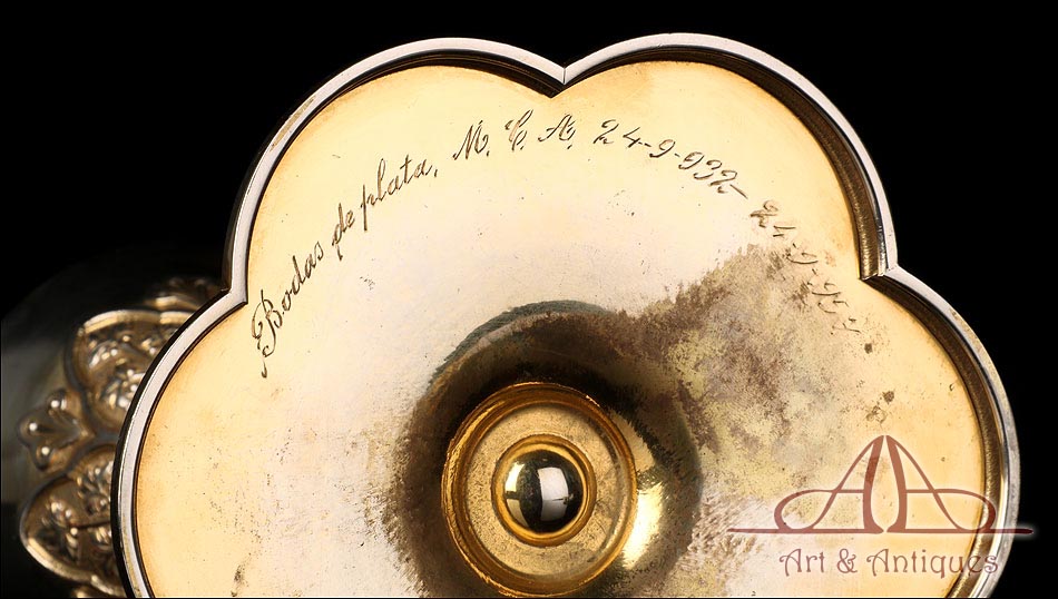 La base del cáliz es amplia y con forma lobulada, un diseño típico de las piezas neogóticas. Está decorada con tres imágenes en metal plateado, inscritas en mandorlas con forma de flor. El resto del metal lleva un bello acabado dorado que se conserva en magníficas condiciones. Si damos la vuelta al cáliz, en la parte inferior de la base encontraremos una inscripción en español grabada a mano en letra cursiva: “Bodas de plata M.C.A, 24-9-932 24-9-957”. Es muy probable que fuera un regalo para celebrar las bodas de plata de la ordenación de un sacerdote, ya que las iniciales corresponden a una sola persona.