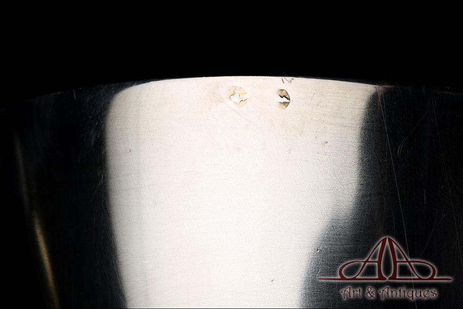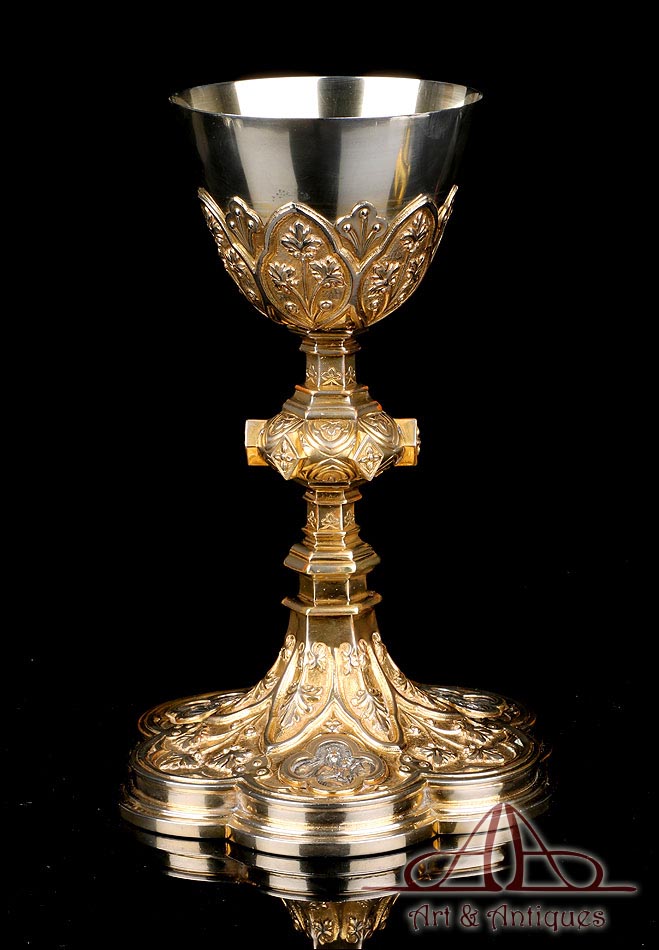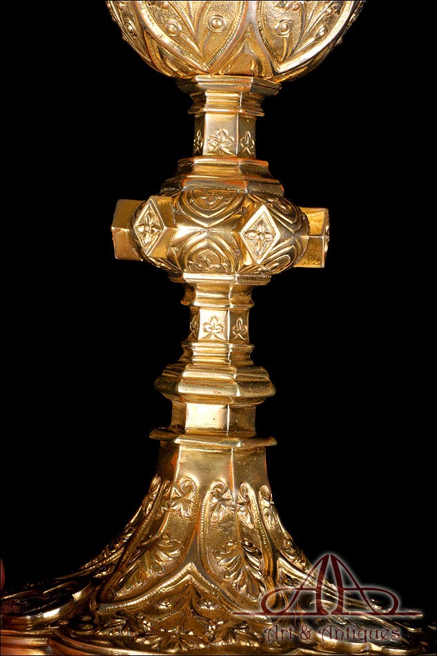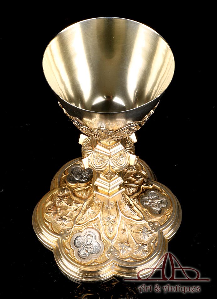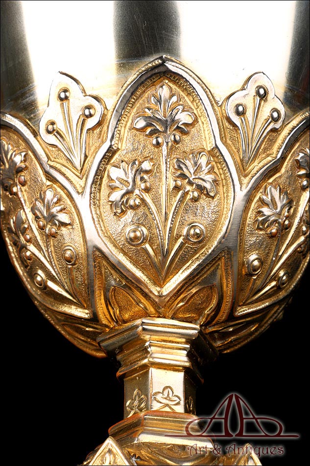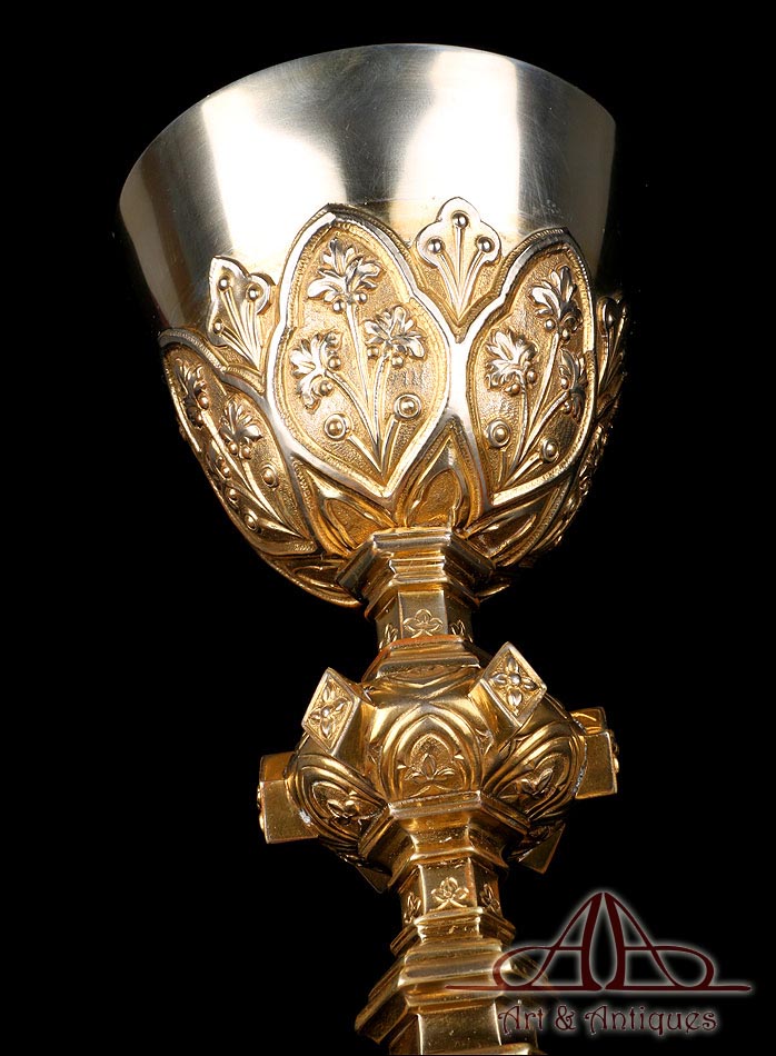 El sobrio diseño y el carisma de este antiguo cáliz de estilo neogótico en plata y metal lo hacen merecedor de un lugar en la mejor colección de platería eclesiástica.