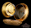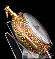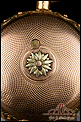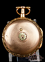 La llave que incluye el reloj se adapta perfectamente a la maquinaria, si bien no es antigua. La caja del reloj lleva en el lateral un botón con doble función: si lo presionamos, se abre la tapa trasera; y si lo movemos hacia un lateral, se abre un pequeño agujero en tapa para introducir la llave. En el canto de la caja hay una serie de diminutas perforaciones, disimuladas entre la decoración de hojas, que dejan salir el delicado sonido de la campanilla. Para que suene bien es importante asegurarse de que la tapa del compartimento de la llave está bien cerrada; de no ser así, el sonido resuena y no resulta nítido.