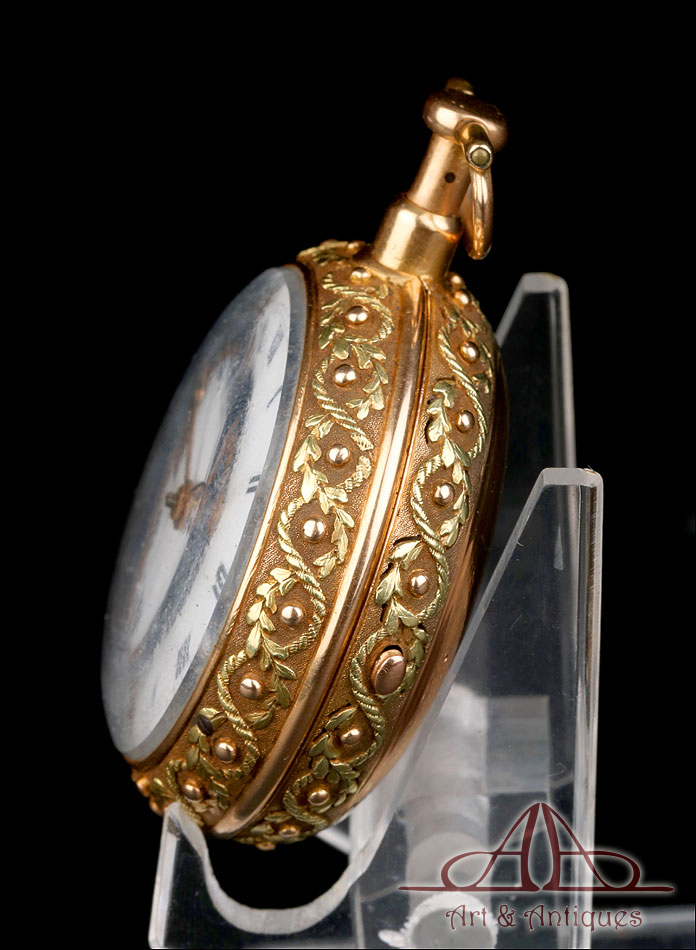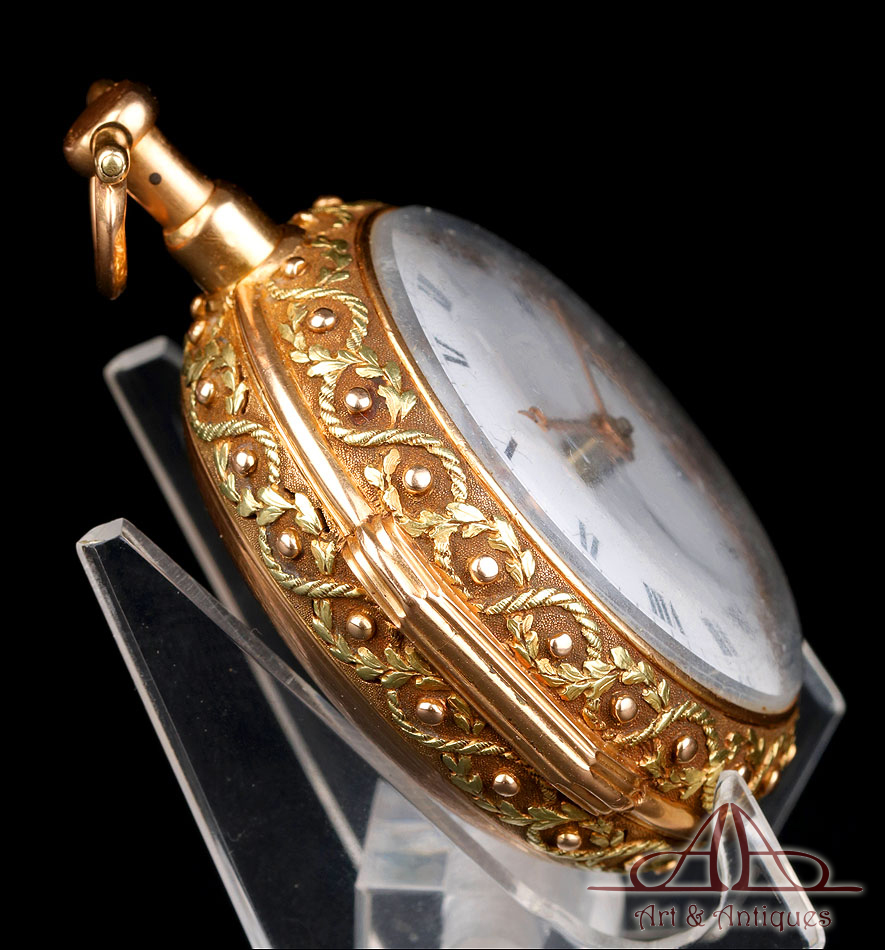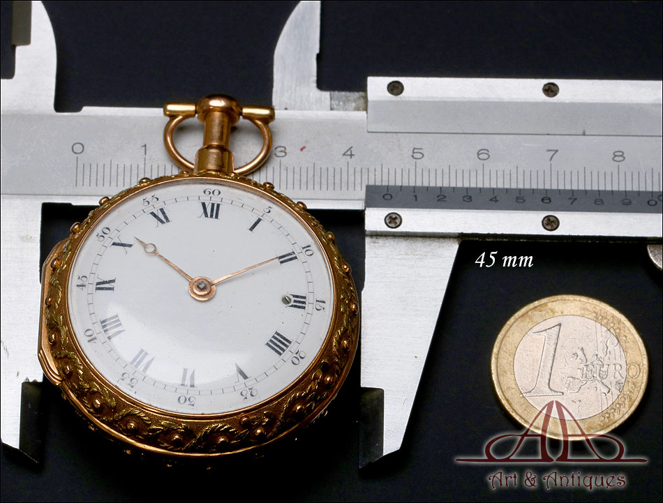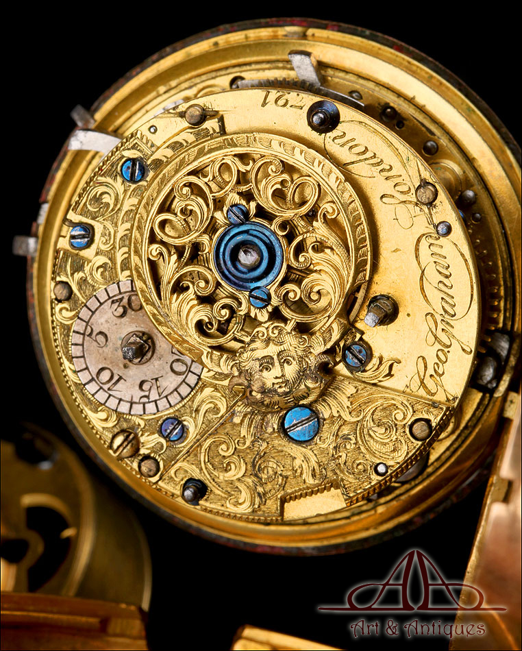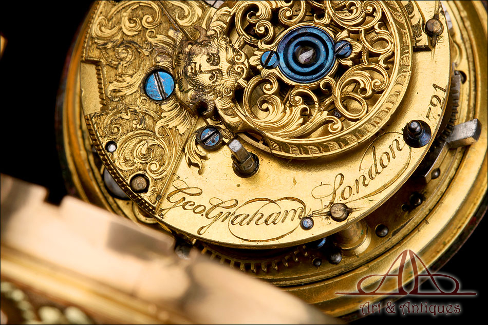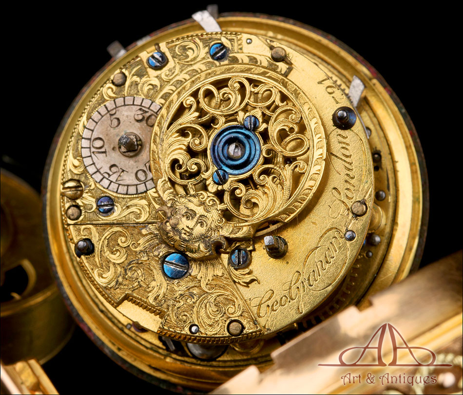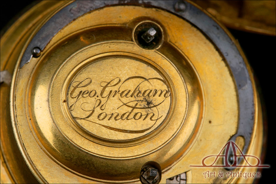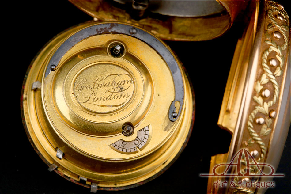 Este espectacular reloj de bolsillo catalino George Grahan con sonería a cuartos y caja de oro 18K fabricada a medida merece formar parte de la colección de relojes antiguos más prestigiosa o de los fondos de un museo de las artes decorativas.