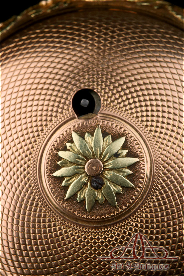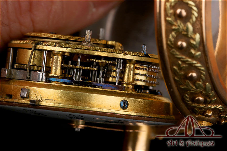 La esfera de porcelana blanca lleva números romanos en negro y marcadores de minutos en numeración arábiga. Las agujas son de tipo breguet y están realizadas en metal dorado. La caja de oro lleva una preciosa decoración en relieve que representa una guirnalda de hojas entrelazada con un cordón. Las hojas llevan una delicada y sutil pátina verde sobre fondo de oro rosa. La tapa trasera lleva decoración en guilloché “grano de avena” y una flor grabada en el centro, con los pétalos también verdes. En el interior de la caja, la maquinaria deslumbra por su belleza y magnífico funcionamiento. La tapa lleva la firma Geo. Graham – London, grabada a mano con maestría y precisión. En el interior, las piezas están decoradas con volutas grabadas y con una cabeza de querubín. De nuevo encontramos la firma de George Graham grabada a mano junto con el número de serie 721.