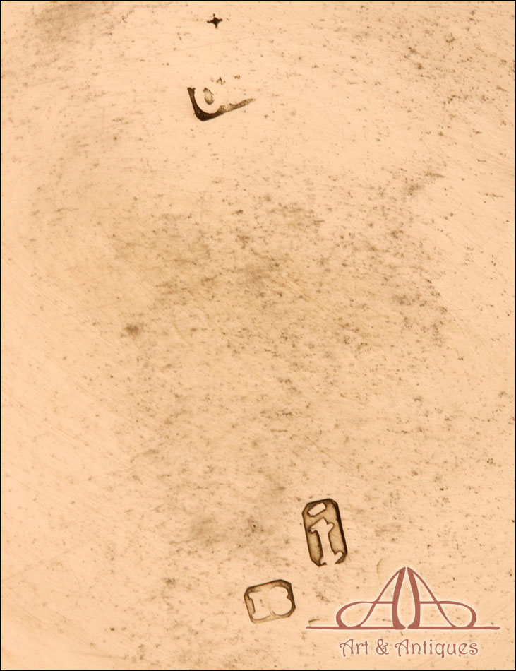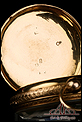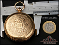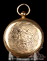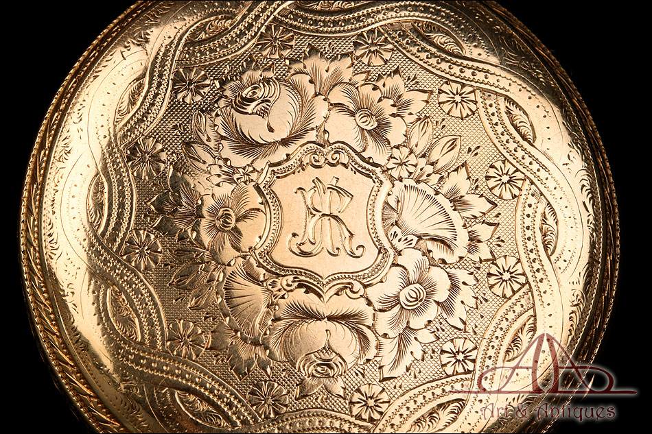 La tapa delantera está decorada con un bellísimo motivo floral que la cubre por completo. El motivo está grabado a mano y muestra una precisión y una delicadeza dignas de un auténtico artista. Está formado por cuerdas entrelazadas y grupos de flores que rodean el escudo central, que contiene dos iniciales bellamente realizadas. En el interior la tapa lleva varios contrastes. Bajo ella vemos la esfera, también de oro, con números romanos negros y agujas de pica y látigo (spade and whip) en metal pavonado. Los números se muestran ligeramente desgastados pero permanecen aún perfectamente legibles. En el centro, un sutil motivo floral aporta un mayor atractivo al diseño.