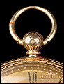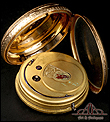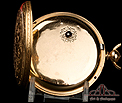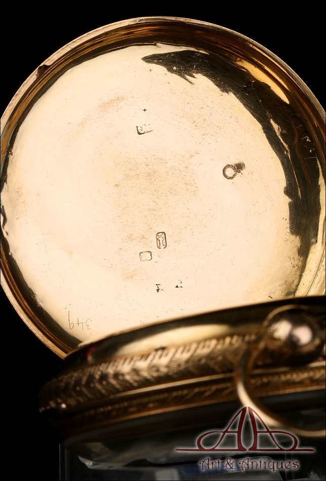 En la corona del reloj podemos ver otro contraste que marca la calidad del oro de este reloj. La tapa trasera lleva también decoración grabada a mano y contrastes internos, mientras que la tapa guardapolvo tiene un pequeño motivo floral grabado alrededor del orificio para dar cuerda al mecanismo. En cuanto a la maquinaria, muestra una fina decoración grabada a mano en las piezas y lleva el número de serie 94162.