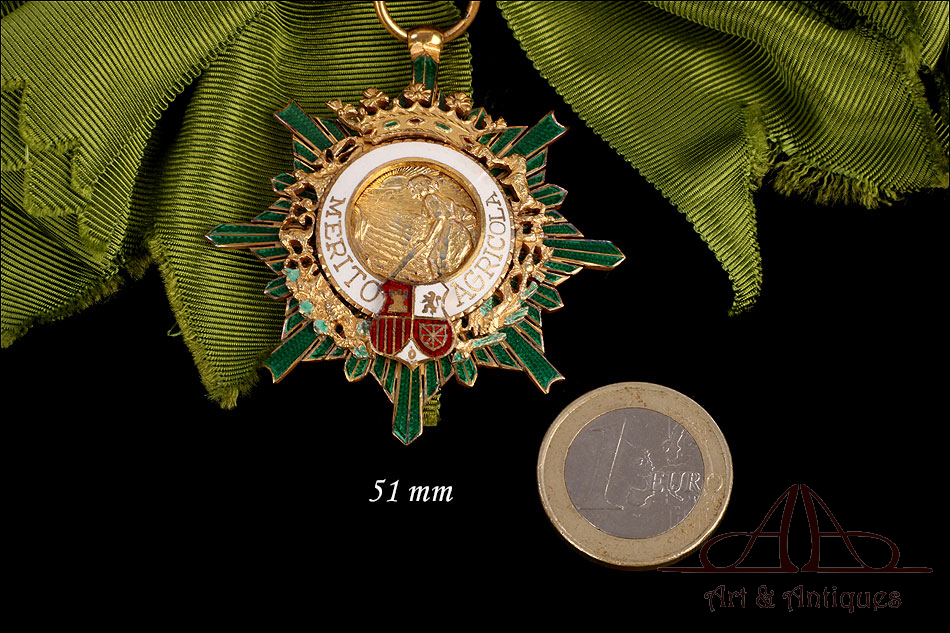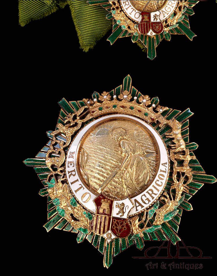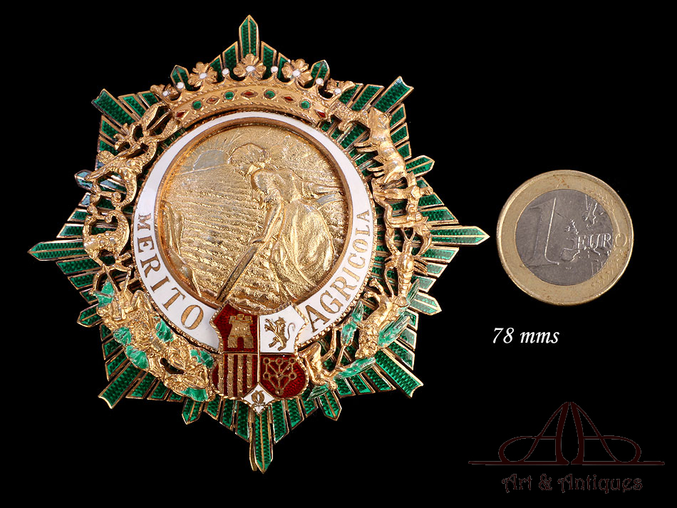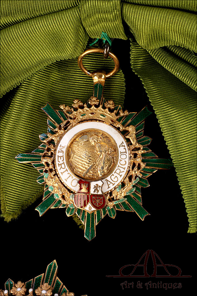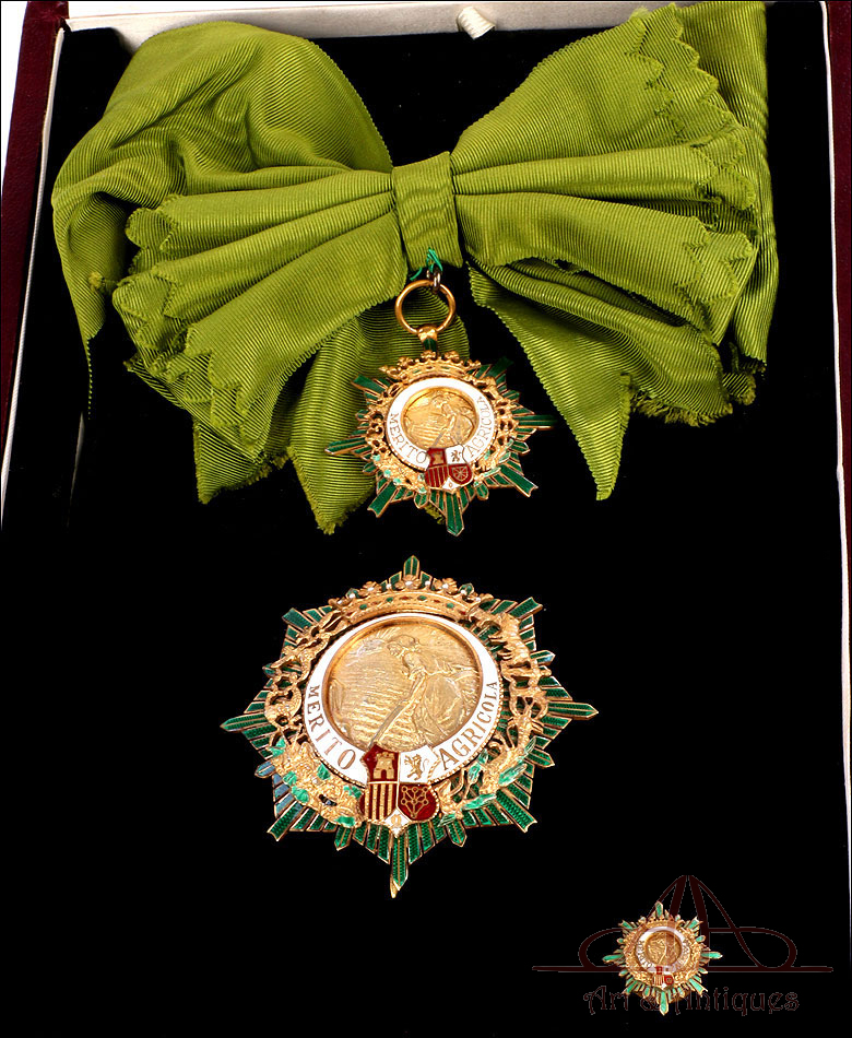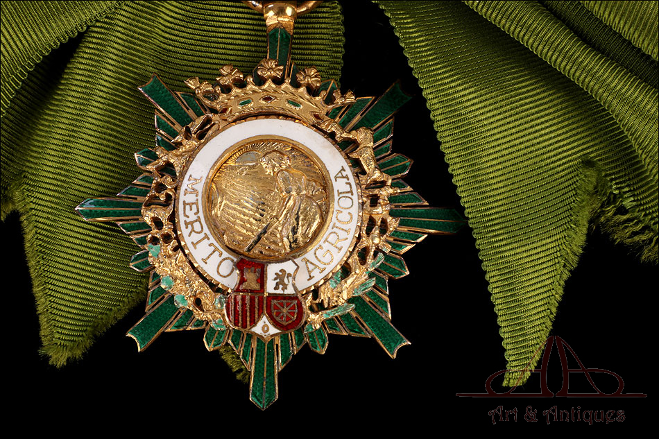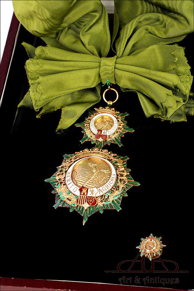Gran Cruz de la Orden del Mérito Agrícola de la época de Franco en su estuche original. Esta magnífica condecoración, en excelentes condiciones, es la máxima categoría a la que se podía aspirar dentro de la Orden. Se trata de una condecoración civil creada en 1905 y que se mantuvo hasta 1987, cuando se convirtió por Real Decreto en la Orden del Mérito Agrario, Pesquero y Alimentario. La pieza está fabricada en plata maciza, dorada y esmaltada. En su centro podemos ver una representación alegórica de la Agricultura, una mujer labrando un campo con una puesta de sol en el fondo. Está rodeada por los signos del zodiaco y un bello despliegue de rayos esmaltados en verde oscuro. En la parte inferior aparece el escudo de Castilla y León, en una banda esmaltada en blanco con las letras MÉRITO AGRÍCOLA en plata dorada. La condecoración conserva la banda original de seda moaré en color verde hierba, y va acompañada de la placa de pecho y la insignia correspondientes, todas ellas en perfecto estado.