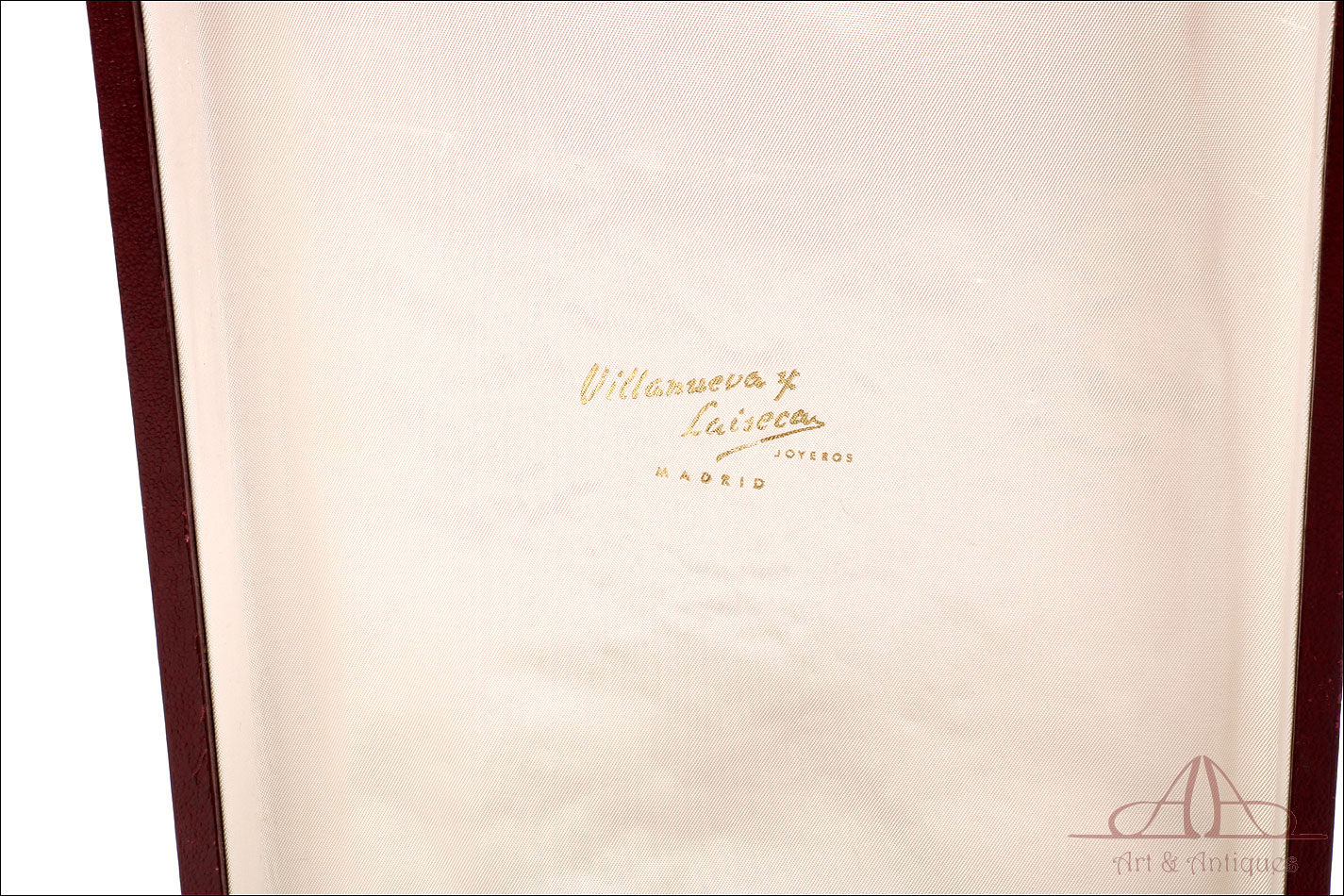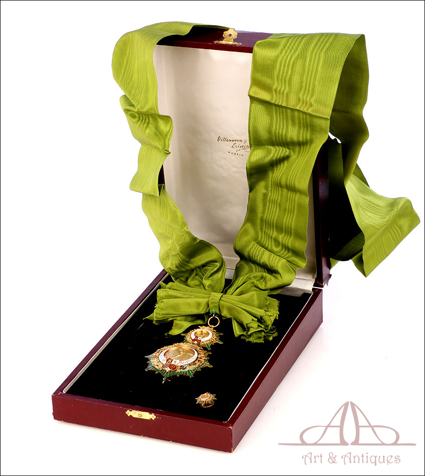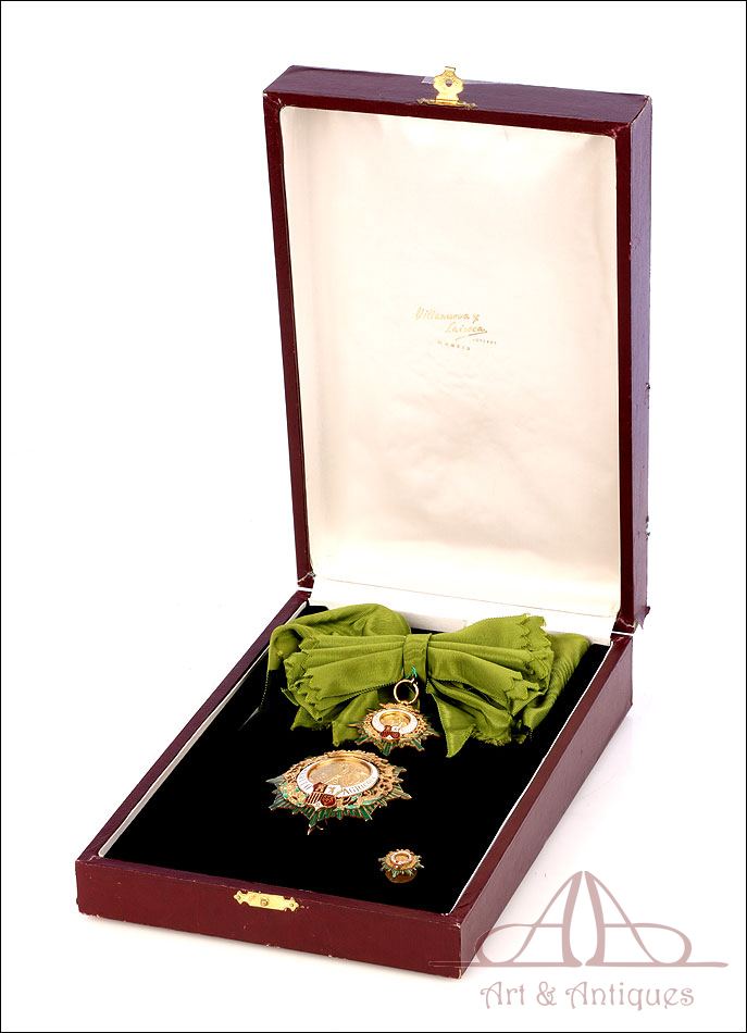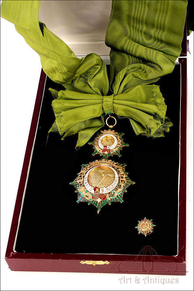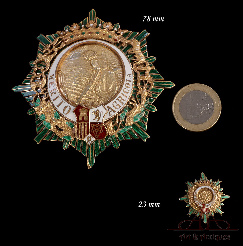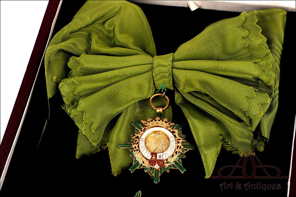 Gran Cruz de la Orden del Mérito Agrícola de la época de Franco en su estuche original. Esta magnífica condecoración, en excelentes condiciones, es la máxima categoría a la que se podía aspirar dentro de la Orden. Se trata de una condecoración civil creada en 1905 y que se mantuvo hasta 1987, cuando se convirtió por Real Decreto en la Orden del Mérito Agrario, Pesquero y Alimentario. La pieza está fabricada en plata maciza, dorada y esmaltada. En su centro podemos ver una representación alegórica de la Agricultura, una mujer labrando un campo con una puesta de sol en el fondo. Está rodeada por los signos del zodiaco y un bello despliegue de rayos esmaltados en verde oscuro. En la parte inferior aparece el escudo de Castilla y León, en una banda esmaltada en blanco con las letras MÉRITO AGRÍCOLA en plata dorada. La condecoración conserva la banda original de seda moaré en color verde hierba, y va acompañada de la placa de pecho y la insignia correspondientes, todas ellas en perfecto estado.