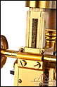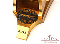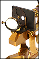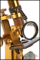 Fijada a la torre del microscopio podemos ver la lupa articulada original de época, perfectamente conservada. El espejo de doble cara situado bajo la pletina también está en óptimas condiciones, a pesar de su fragilidad. En la parte posterior de la base de latón encontramos una placa con el nombre del fabricante, PILLISCHER LONDON, y el número de serie grabado en el metal: 3193. El aparato va acompañado de un juego de dos lentes y dos oculares. Todo el conjunto se guarda en una caja de época de madera de caoba maciza, con compartimentos interiores para los accesorios.