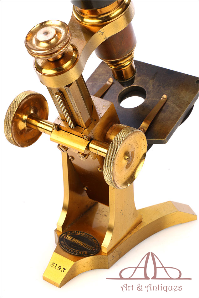 Rarísimo microscopio inglés antiguo de latón Pillischer fabricado circa 1890, completo y en fantástico estado de conservación. El microscopio está fabricado íntegramente en latón, que se conserva casi como nuevo y mantiene el acabado lacado transparente que protege su superficie. Esta laca antigua le aporta una pátina cálida y profunda, característica de los aparatos de finales del siglo XIX y estéticamente muy atractiva. El microscopio funciona perfectamente y conserva la cremallera en perfecto estado. El sistema de ajuste fino contiene restos de grasa antigua que hacen que no se desplace bien hacia arriba. Sin embargo, se puede utilizar presionando ligeramente con la mano.