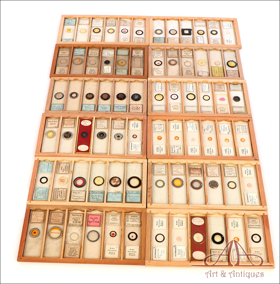Esta colección de 60 preparados antiguos para microscopio hará disfrutar a cualquier amante de la ciencia y de los microscopios de época.